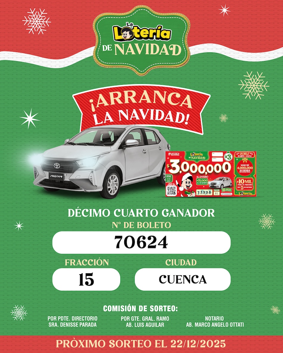 Este lunes 15 de diciembre del 2025 se realizó el décimo cuarto sorteo semanal de autos de La Lotería de Navidad, una de las promociones más destacadas de la temporada, que continúa premiando a los jugadores a nivel nacional.