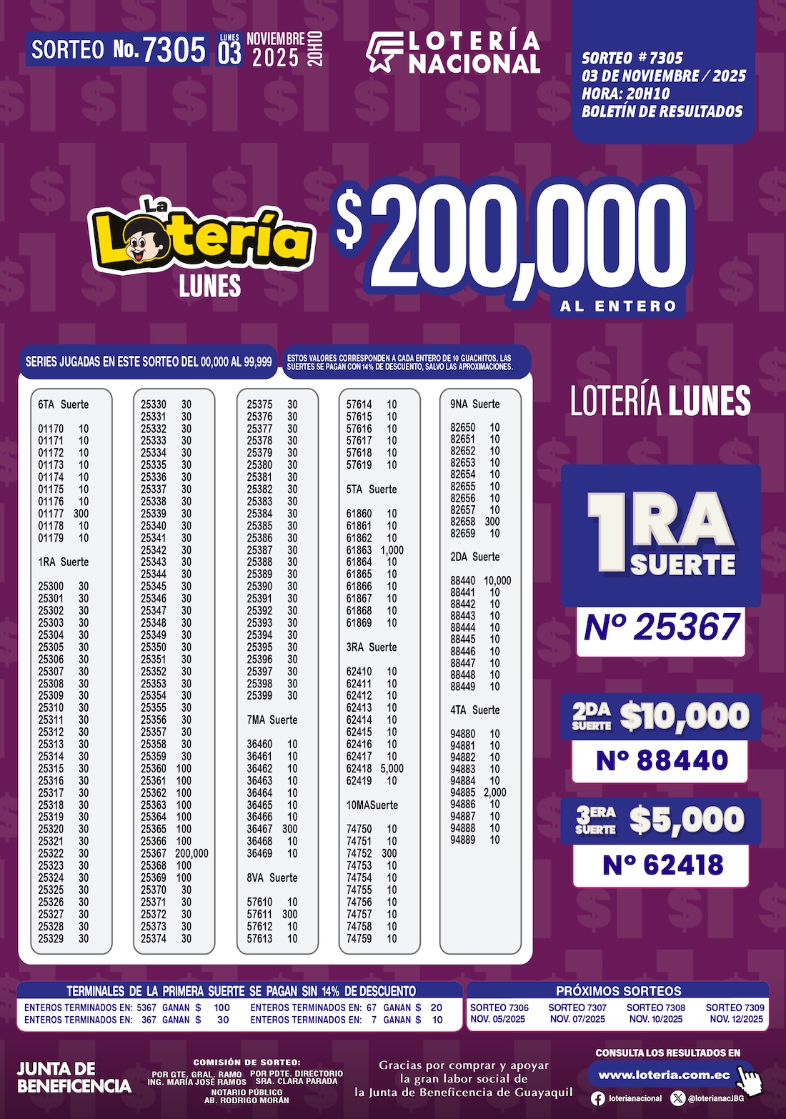 La Lotería Nacional del Ecuador realizó el sorteo N.º 7305 de La Lotería el lunes 3 de noviembre de 2025, con un premio mayor de $200,000 al entero.