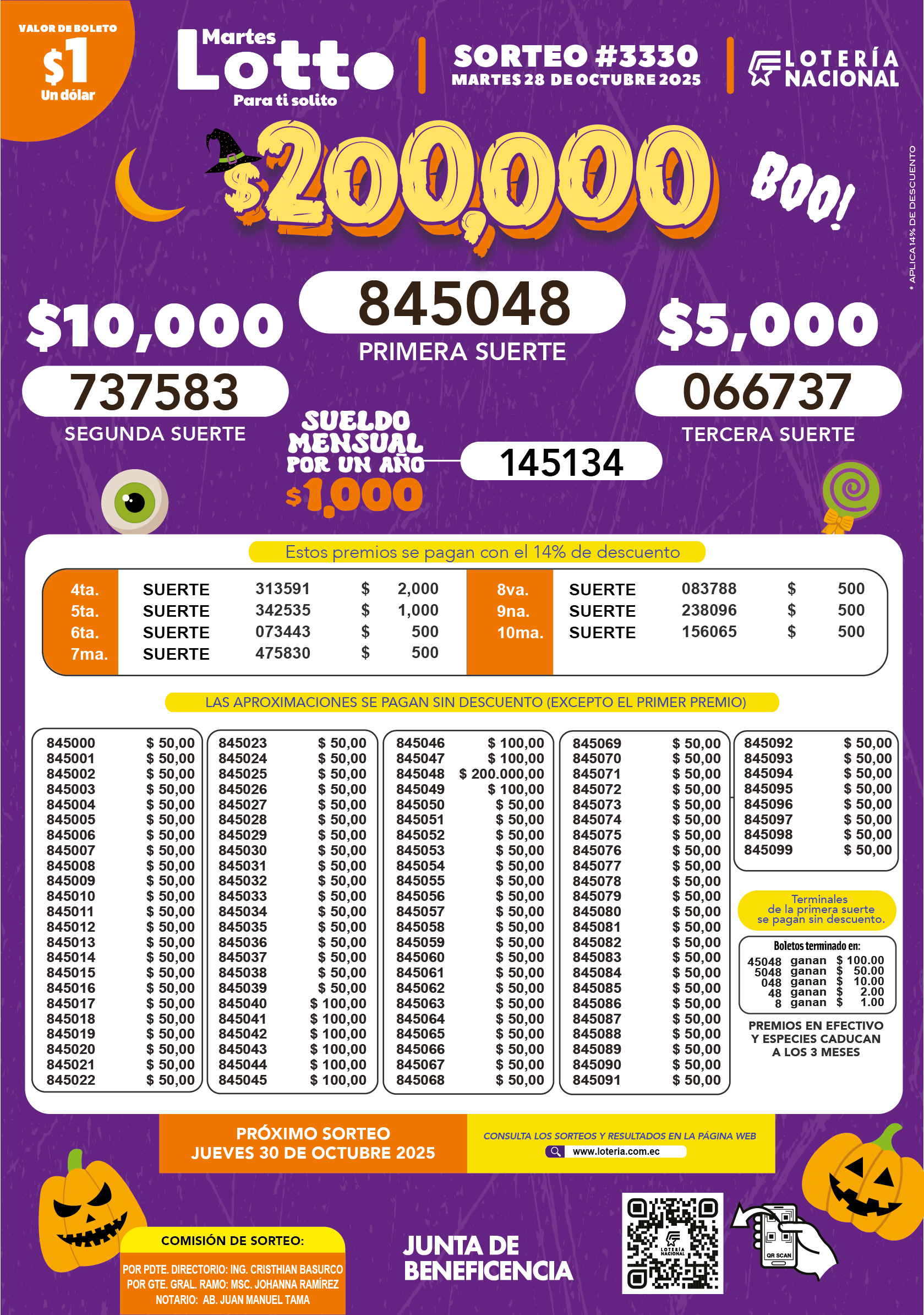 El Lotto para ti solito celebró su sorteo N.º 3330 el martes 28 de octubre de 2025, premiando la suerte de miles de ecuatorianos con un pozo total de $200,000 al entero.