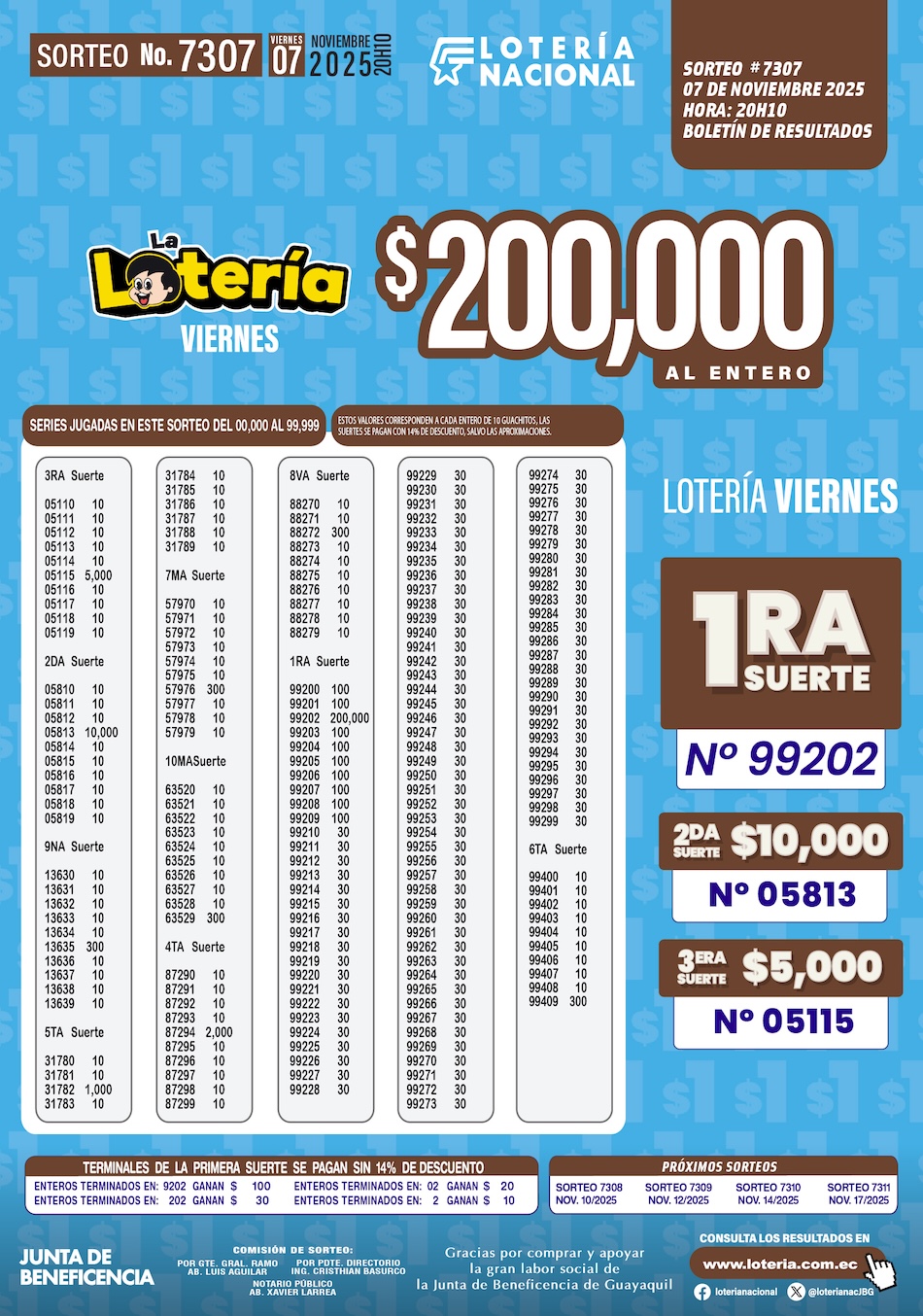 Este viernes 07 de noviembre del 2025, La Lotería de la Lotería Nacional celebró su sorteo Nº 7307, repartiendo miles de dólares en premios y llevando la suerte a jugadores en todo el país. Con un premio mayor de $200,000 al entero, esta edición volvió a llenar de emoción la noche de los ecuatorianos. 🍀💙