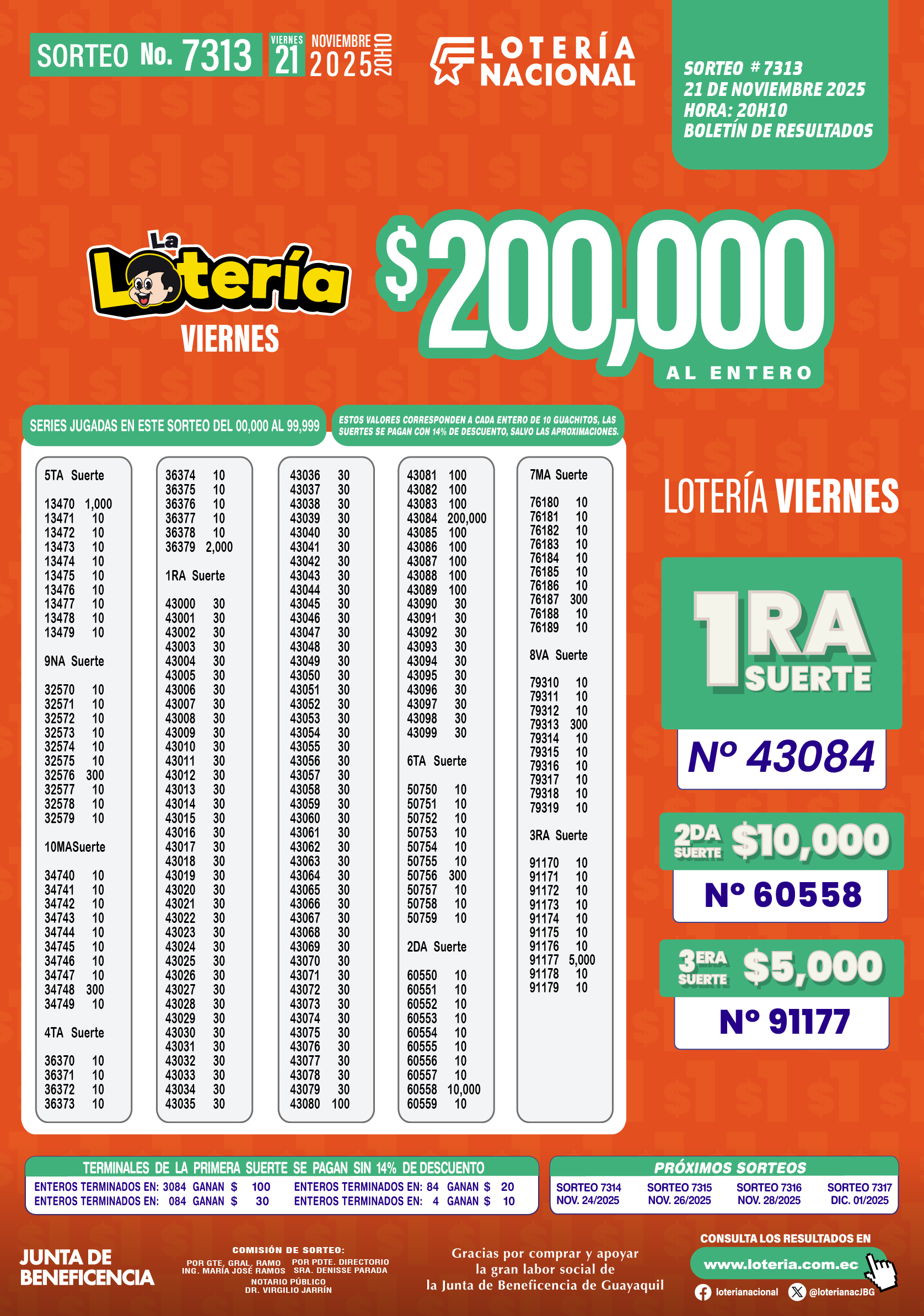 Este viernes 21 de noviembre del 2025 se realizó el Sorteo Nº 7313 de La Lotería, donde miles de jugadores participaron con la ilusión de acertar su número y llevarse el premio mayor de $200,000 al entero.
