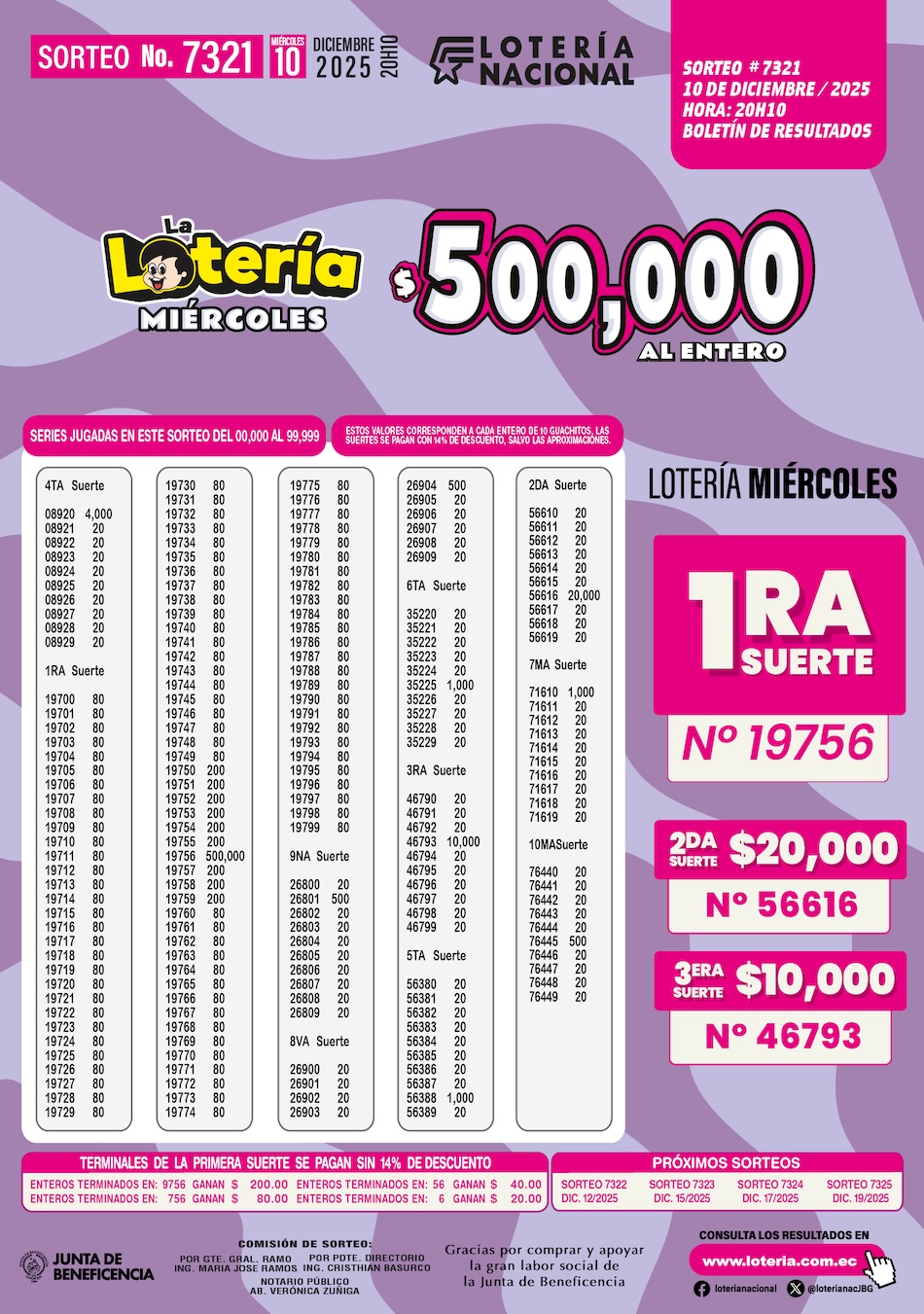 Este miércoles 10 de diciembre del 2025, a las 20h10, se realizó el Sorteo N.º 7321 de La Lotería, uno de los juegos tradicionales de Lotería Nacional, que entrega grandes premios y múltiples oportunidades de ganar en cada edición.
