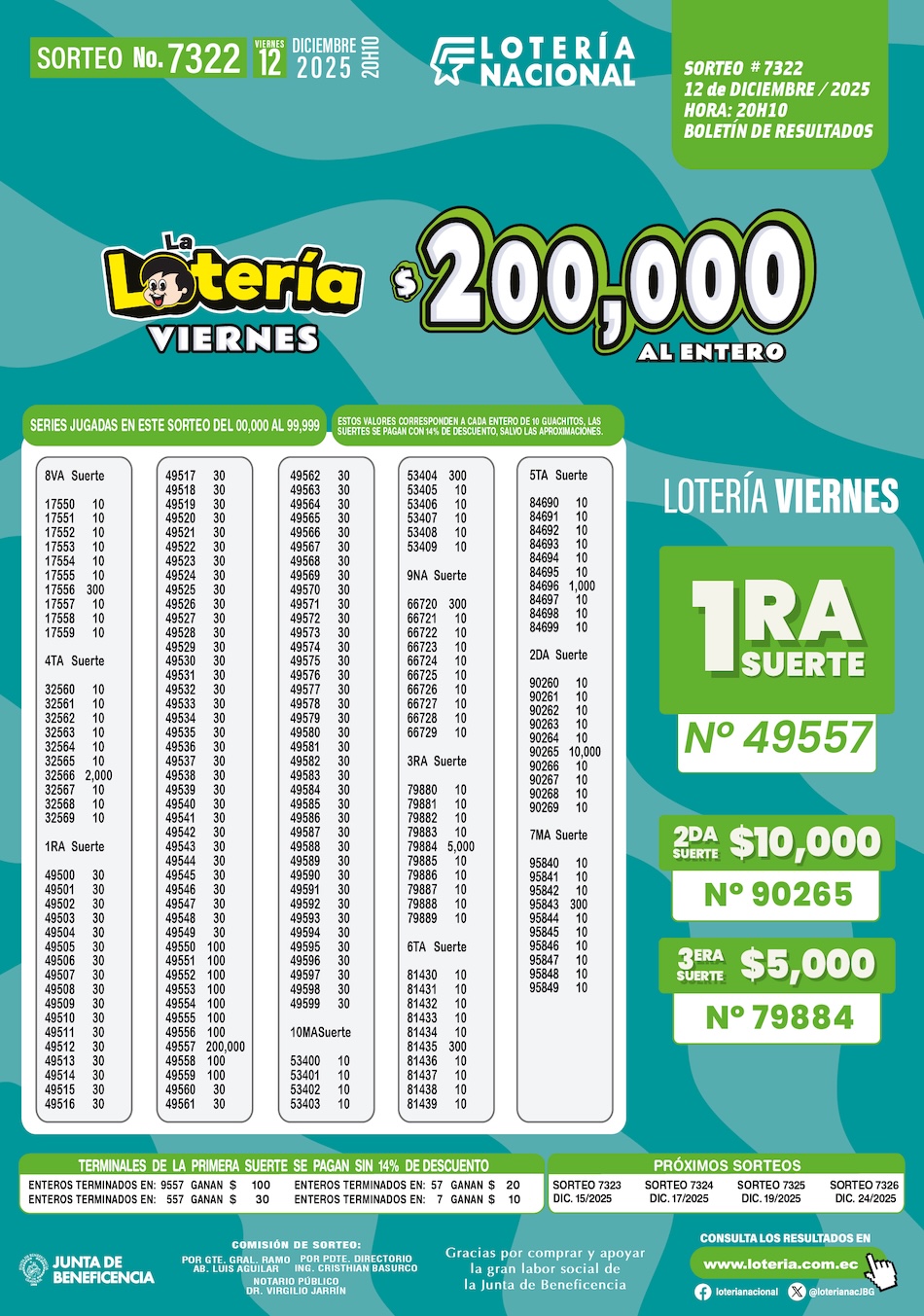 Este viernes 12 de diciembre del 2025, a las 20h10, se realizó el Sorteo N.º 7322 de La Lotería, uno de los juegos tradicionales de Lotería Nacional, reconocido por sus premios al entero y por su impacto social a nivel nacional.