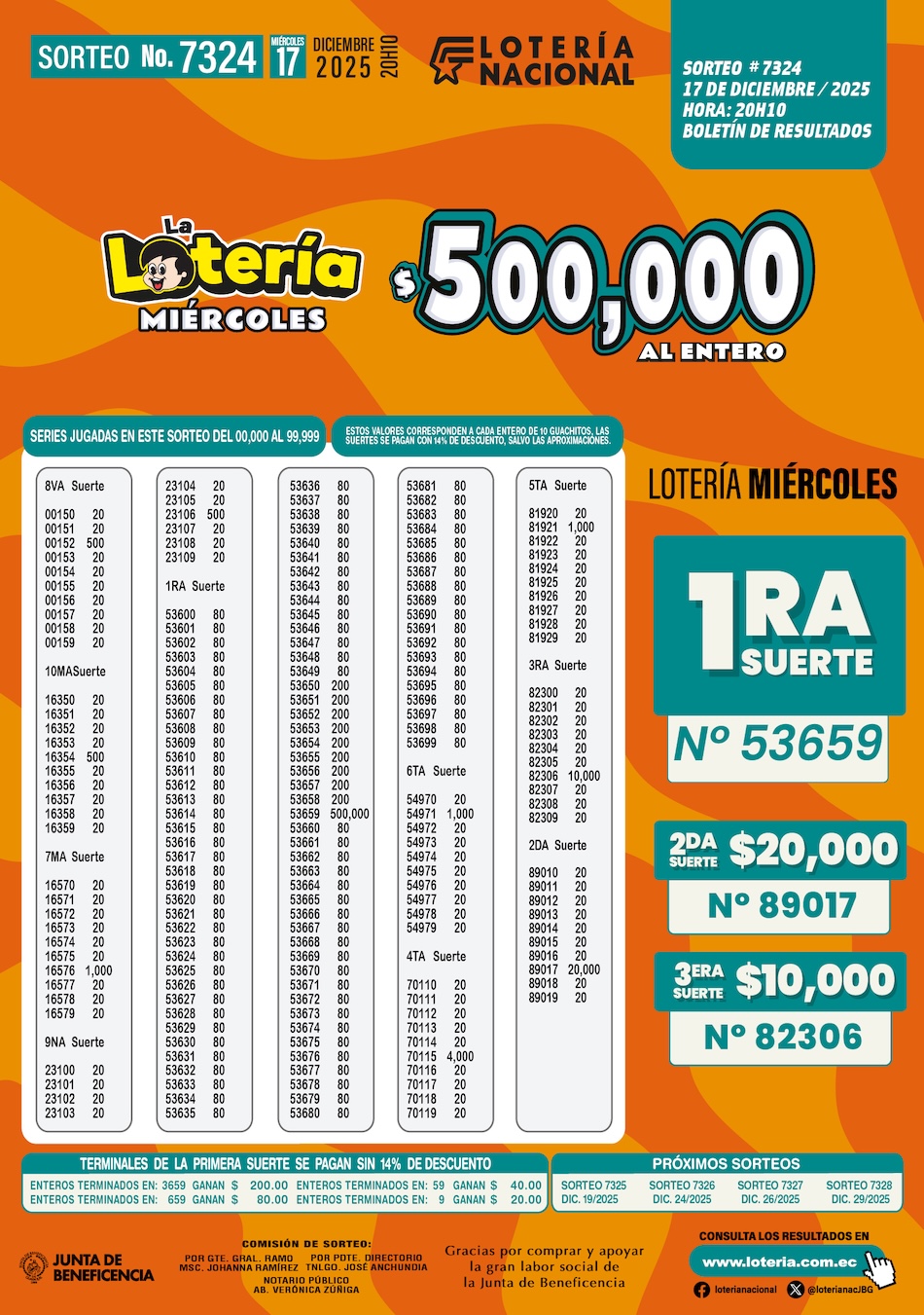Este miércoles 17 de diciembre del 2025 se llevó a cabo el Sorteo N.º 7324 de La Lotería, uno de los sorteos más esperados de la Lotería Nacional, que en esta edición entregó un premio mayor de USD 500.000 al entero, consolidándose como una de las principales alternativas de participación solidaria en el país.