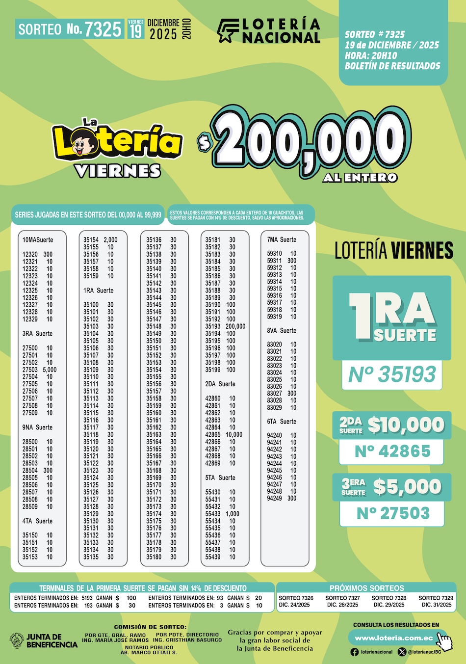 Este viernes 19 de diciembre del 2025 se desarrolló con total normalidad el Sorteo N.º 7325 de La Lotería, organizado por la Lotería Nacional, una de las modalidades tradicionales que semana a semana convoca a miles de participantes en todo el país y que, además, respalda de forma directa la labor social de la Junta de Beneficencia de Guayaquil.