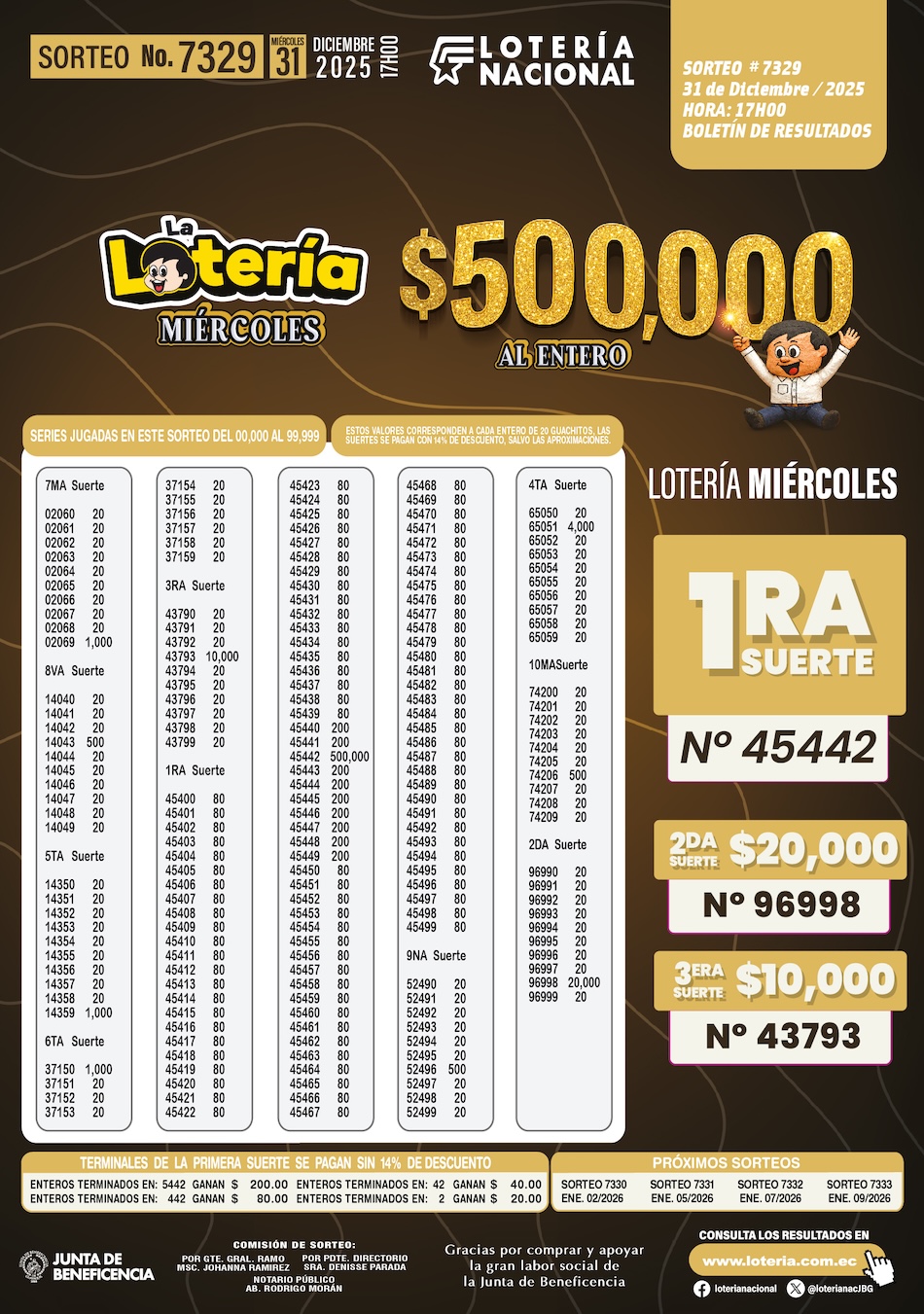 Este miércoles 31 de diciembre del 2025, en la antesala del cierre de año, se desarrolló con total normalidad el Sorteo N.º 7329 de La Lotería, organizado por la Lotería Nacional, una de las modalidades tradicionales que acompaña a los ecuatorianos durante todo el año y que, además, contribuye de forma directa a la labor social de la Junta de Beneficencia de Guayaquil.