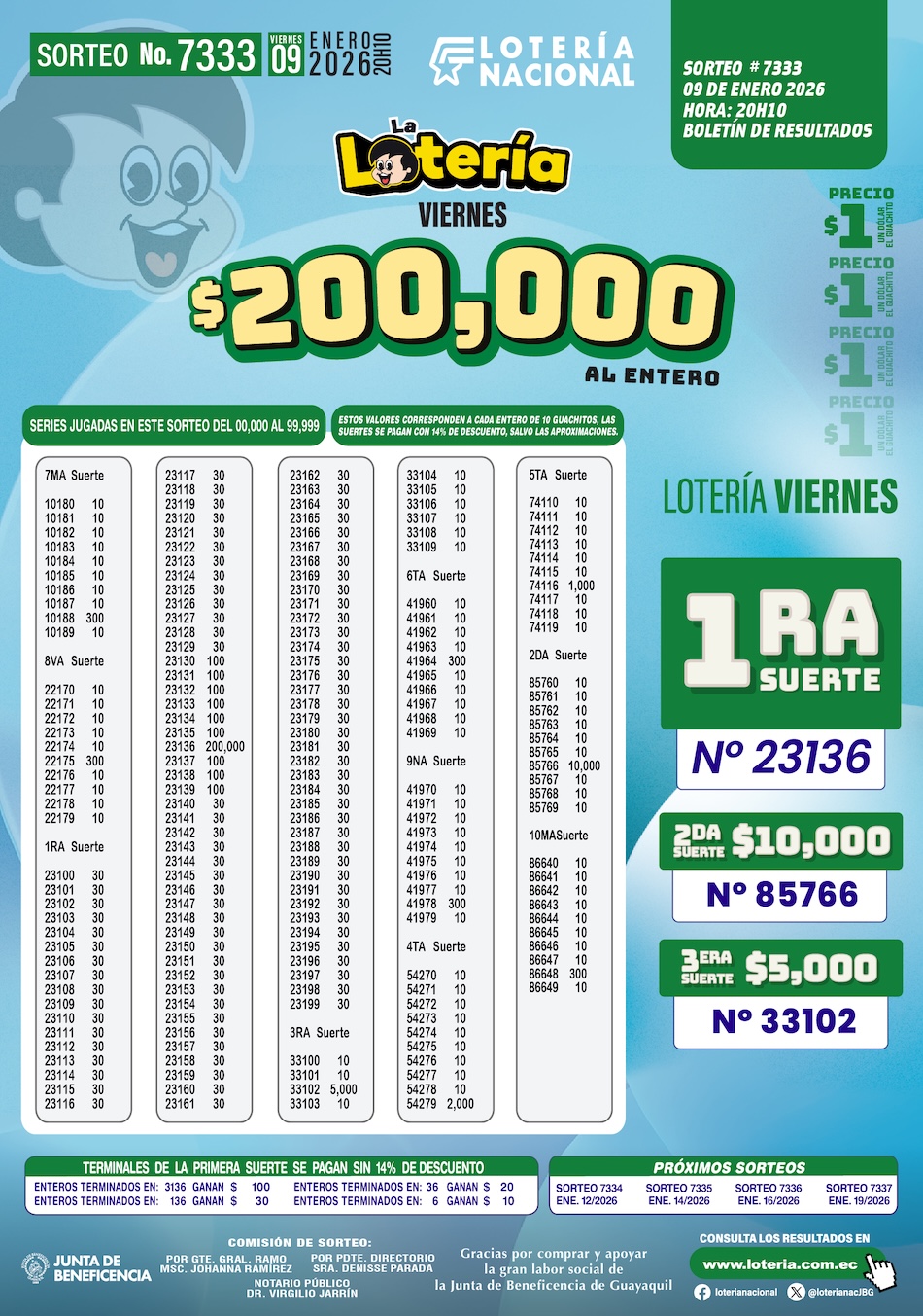 Este viernes 9 de enero del 2026 se desarrolló con total normalidad el Sorteo N.º 7333 de La Lotería, organizado por la Lotería Nacional, una de las modalidades tradicionales que continúa acompañando semana a semana a miles de ecuatorianos y que, además, contribuye de forma directa a la labor social de la Junta de Beneficencia de Guayaquil.