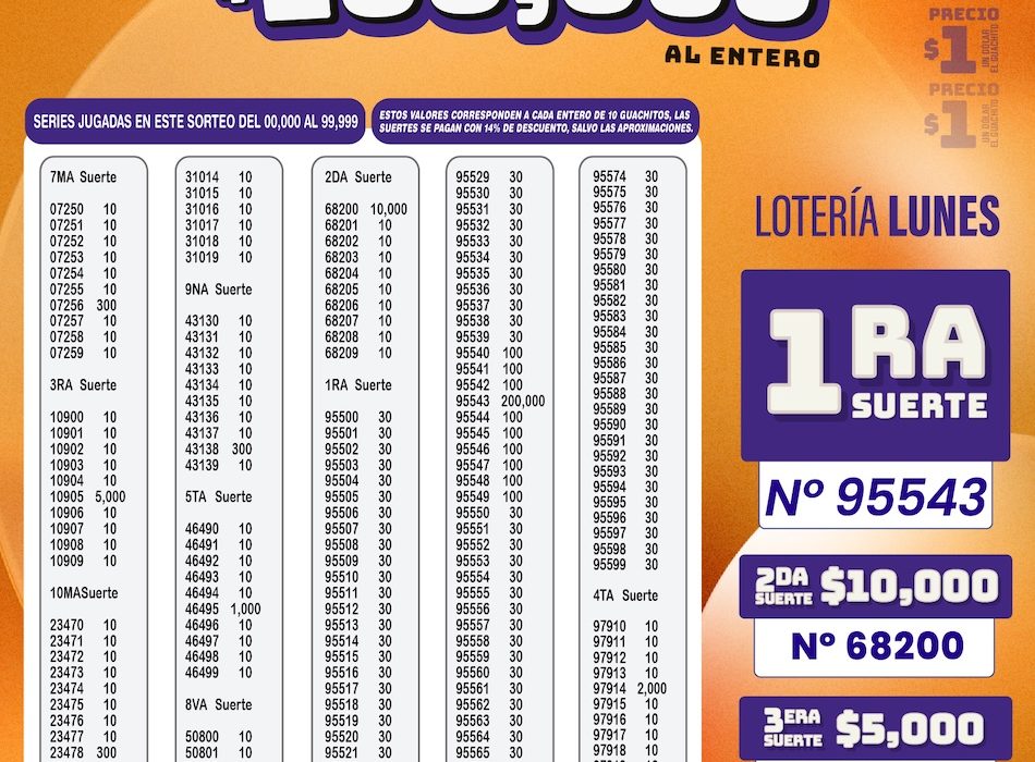 En esta edición, el sorteo entregó un premio mayor de USD 200.000 al entero, junto a diversas suertes adicionales, consolidando a La Lotería de los lunes como una de las opciones más seguidas por el público a nivel nacional.