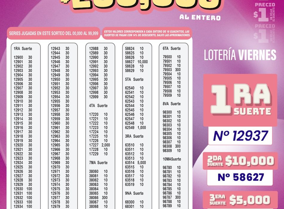 En esta edición correspondiente a La Lotería de los viernes, el sorteo entregó un premio mayor de USD 200.000 al entero, junto a diversas suertes adicionales que continúan despertando el interés del público a nivel nacional.