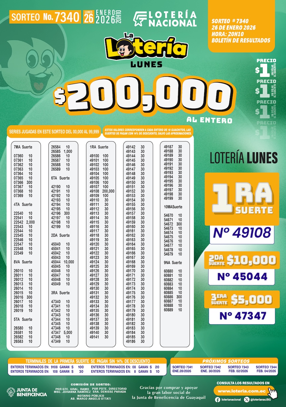 Este lunes 26 de enero del 2026 se desarrolló con total normalidad el Sorteo N.º 7340 de La Lotería, organizado por la Lotería Nacional, una de las modalidades tradicionales que se juegan lunes, miércoles y viernes en todo el país y que, además, contribuye de forma directa a la labor social de la Junta de Beneficencia de Guayaquil.