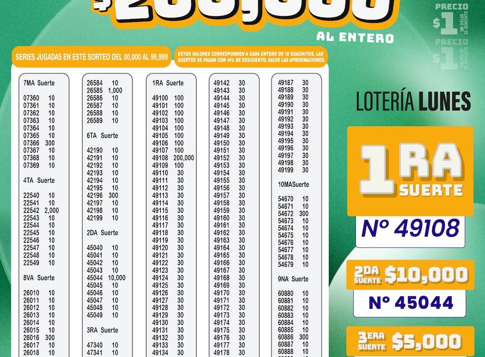 En esta edición correspondiente a La Lotería de los lunes, el sorteo entregó un premio mayor de USD 200.000 al entero, junto a diversas suertes adicionales, manteniendo el interés del público ecuatoriano al inicio de la semana.