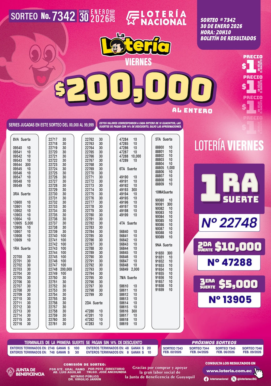 Este viernes 30 de enero del 2026 se desarrolló con total normalidad el Sorteo N.º 7342 de La Lotería, organizado por la Lotería Nacional, una de las modalidades tradicionales que se juegan lunes, miércoles y viernes en todo el país y que, además, contribuye de forma directa a la labor social de la Junta de Beneficencia de Guayaquil.