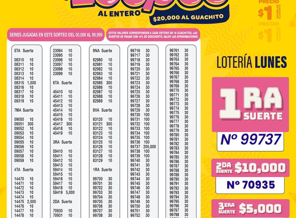 En esta edición correspondiente a La Lotería de los lunes, el sorteo entregó un premio mayor de USD 200.000 al entero, equivalente a USD 20.000 al guachito, manteniendo la emoción entre miles de participantes en todo el Ecuador.