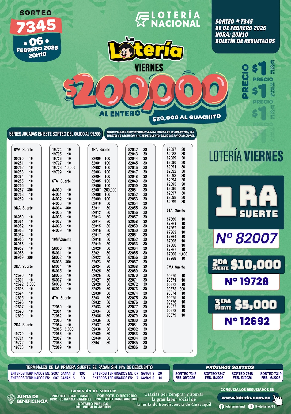 Este viernes 06 de febrero del 2026 se desarrolló con total normalidad el Sorteo N.º 7345 de La Lotería, organizado por la Lotería Nacional, modalidad tradicional que se juega lunes, miércoles y viernes en todo el país y que respalda directamente la labor social de la Junta de Beneficencia de Guayaquil.