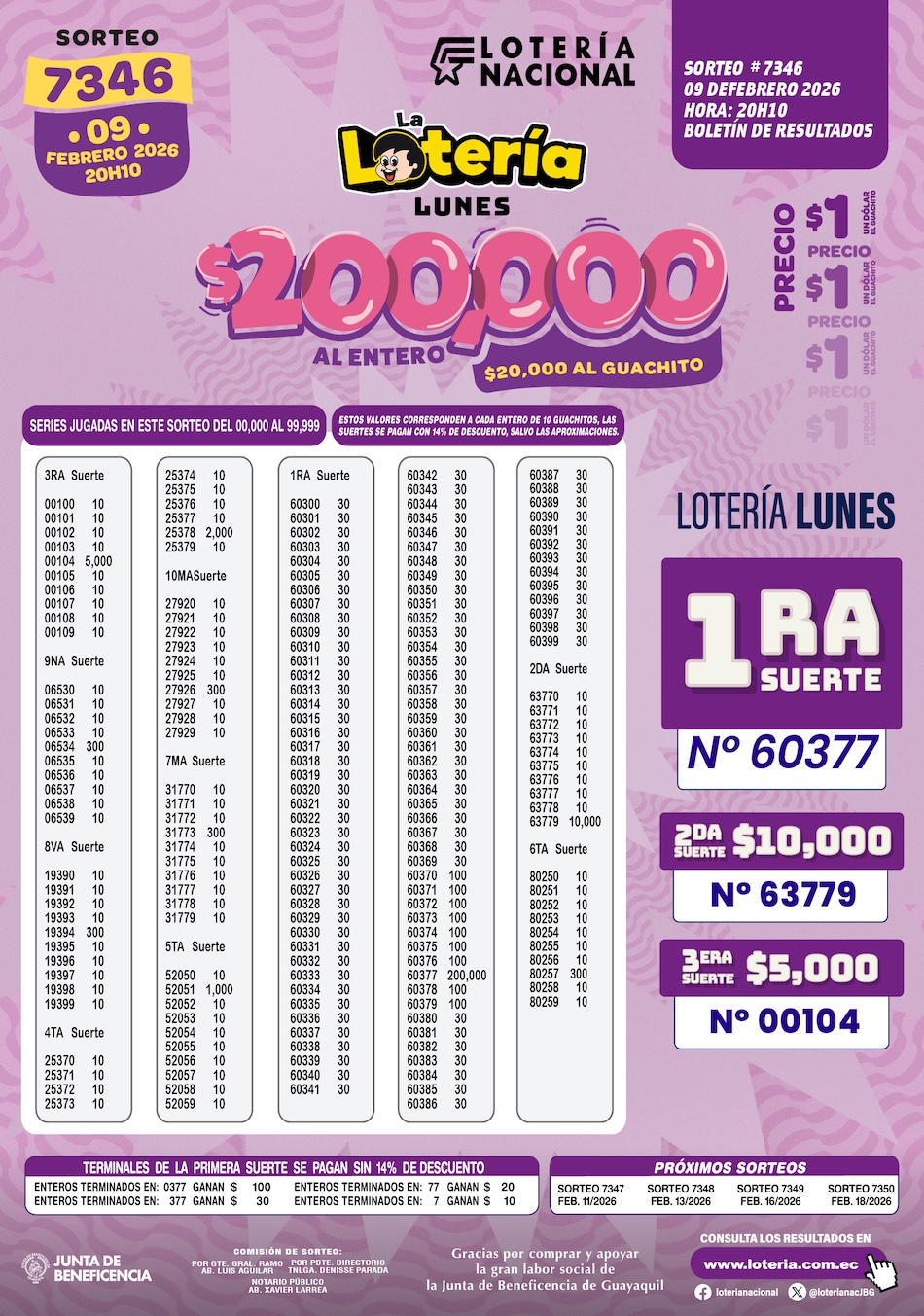 Este lunes 09 de febrero del 2026 se realizó con total normalidad el Sorteo N.º 7346 de La Lotería, organizado por la Lotería Nacional, modalidad tradicional que se juega lunes, miércoles y viernes en todo el país y que aporta directamente a la labor social de la Junta de Beneficencia de Guayaquil.