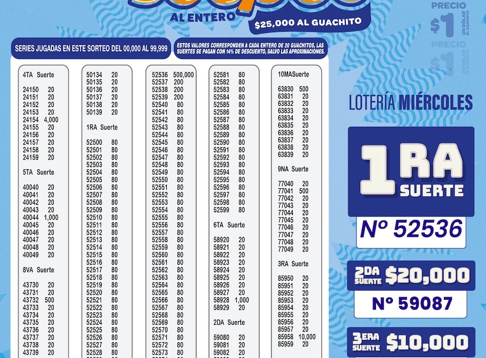En esta edición correspondiente a La Lotería de los miércoles, el sorteo entregó un premio mayor de USD 500.000 al entero, equivalente a USD 25.000 al guachito, consolidándose como uno de los premios más atractivos de la semana.