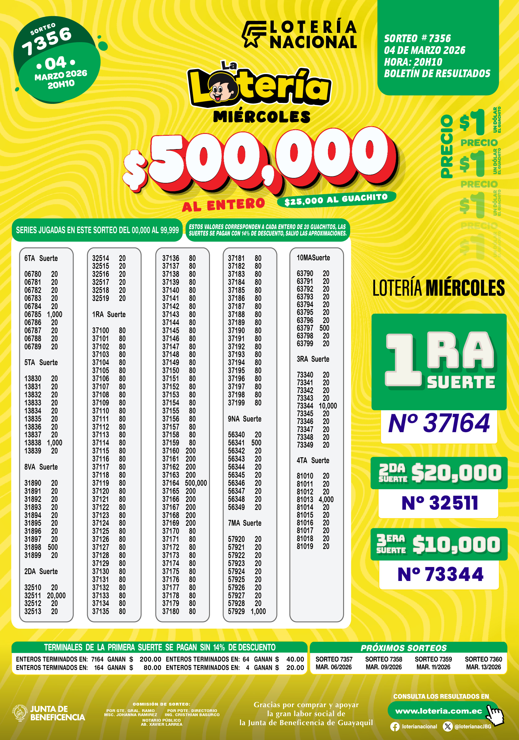 Aquí se encontraras los resultados de La Lotería del sorteo 7356 del miercoles, 4 de marzo de 2026