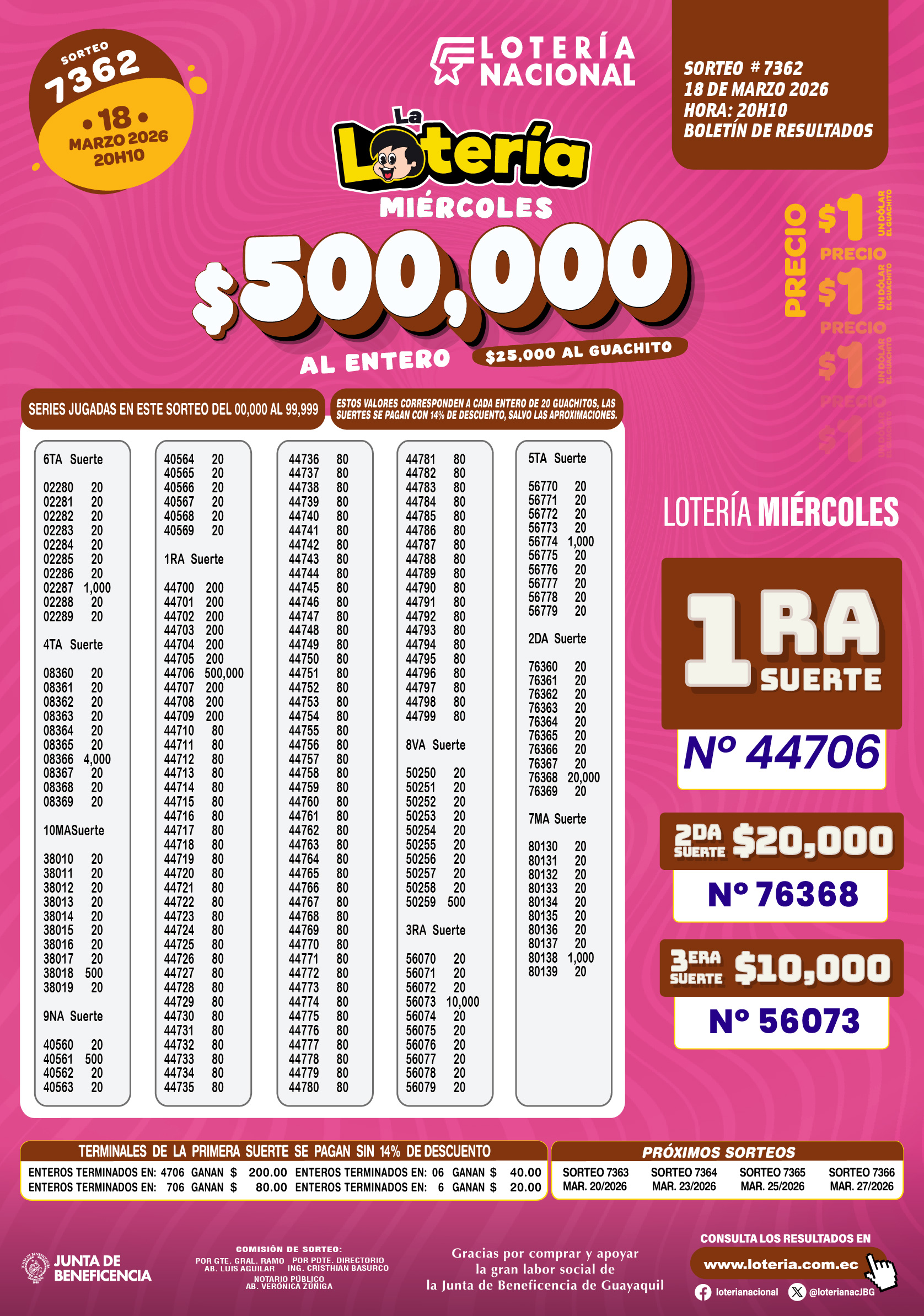 Aquí se encontraras los resultados de La Lotería del sorteo 7362 del miercoles, 18 de marzo de 2026