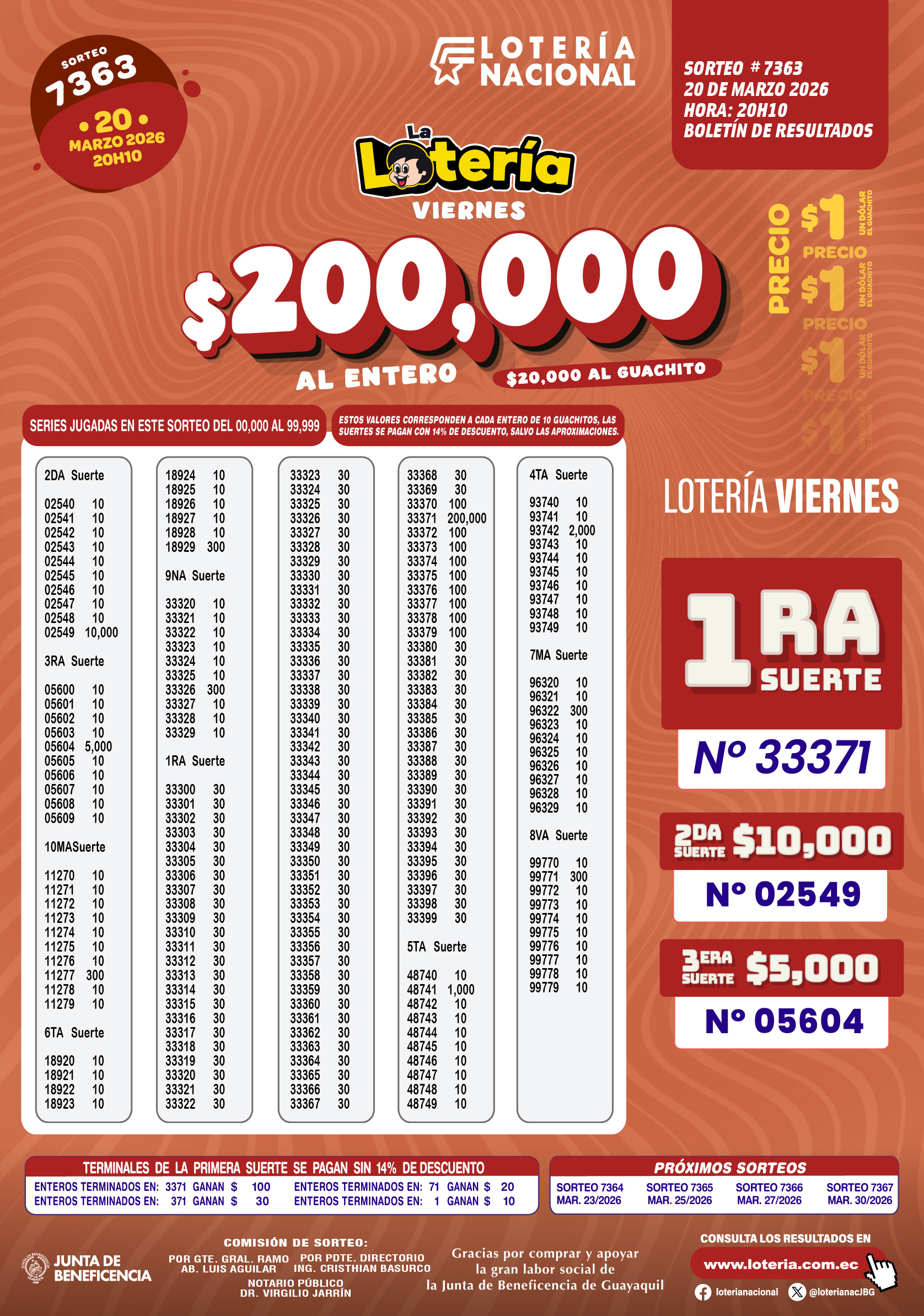 Aquí se encontraras los resultados de La Lotería del sorteo 7363 del viernes, 20 de marzo de 2026