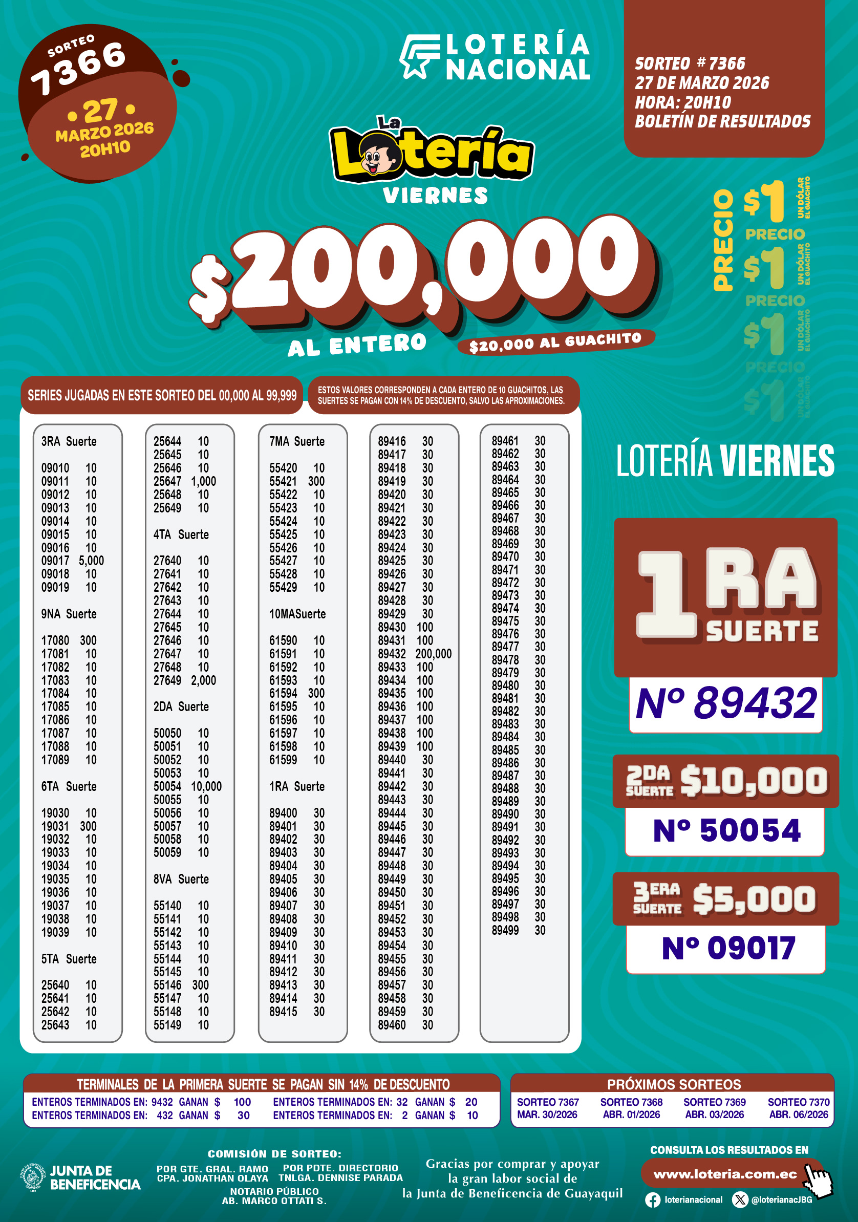 Aquí se encontraras los resultados de La Lotería del sorteo 7366 del viernes, 27 de marzo de 2026