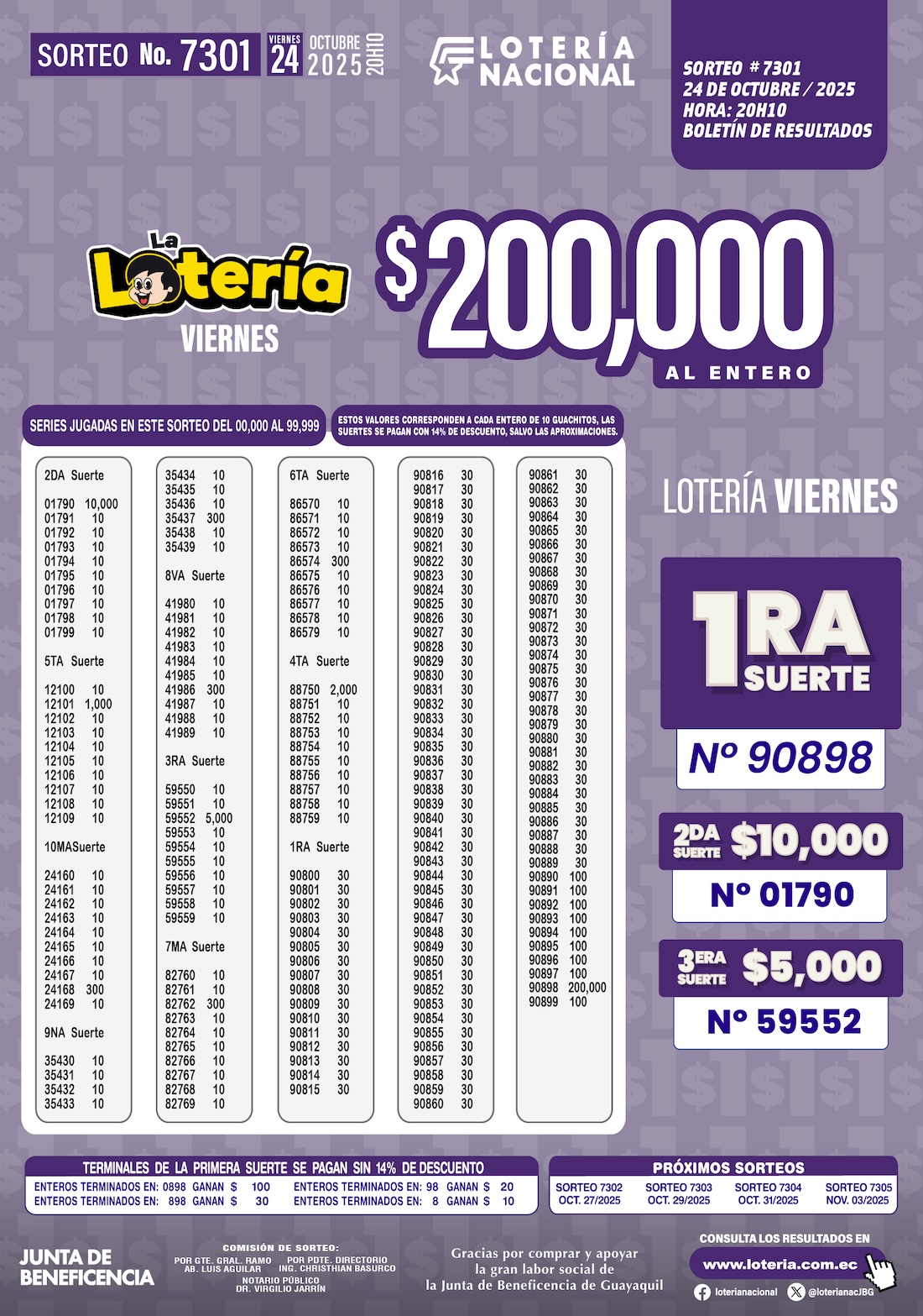 La Lotería Nacional del Ecuador realizó el sorteo N.º 7301 el viernes 24 de octubre de 2025, entregando un premio mayor de $200,000 al entero.