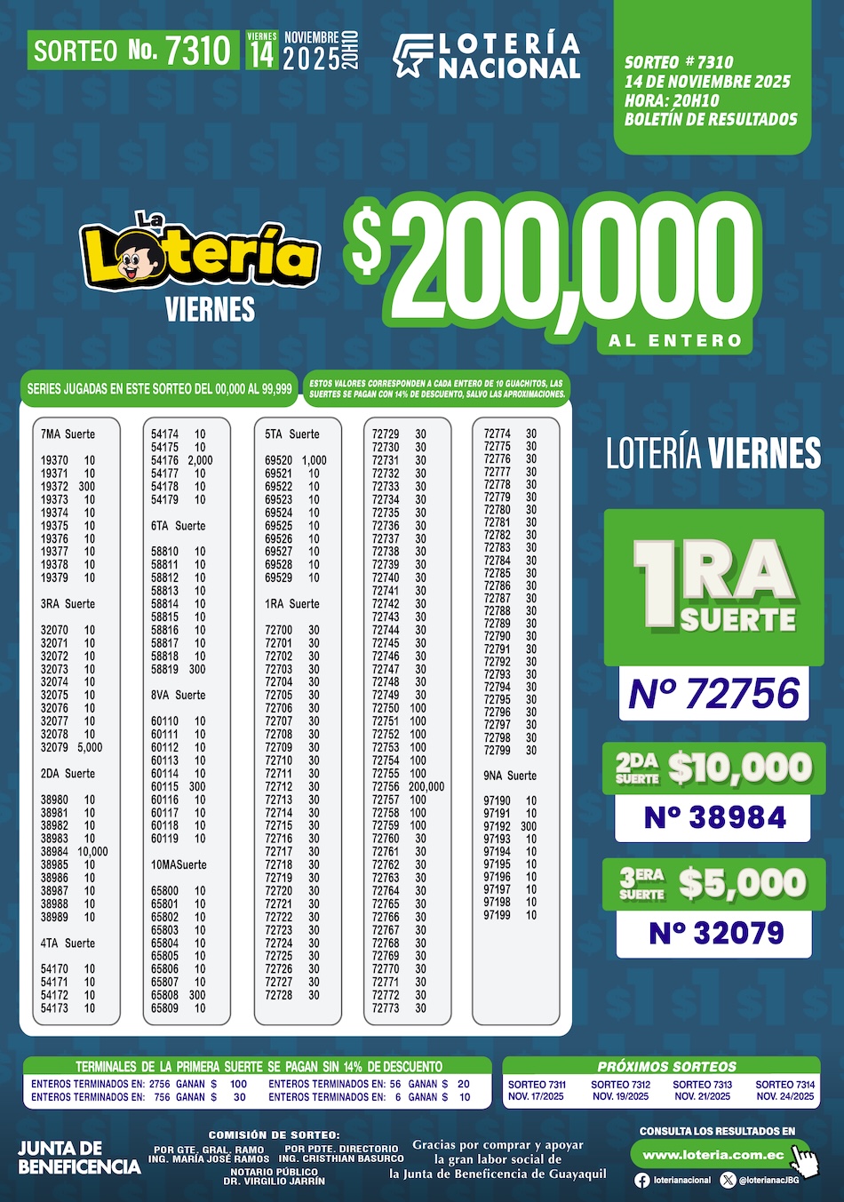 Este viernes 14 de noviembre de 2025, a las 20h10, se realizó el Sorteo N.º 7310 de Lotería Nacional, correspondiente a la edición Lotería Viernes, con un premio mayor de $200,000 al entero.
