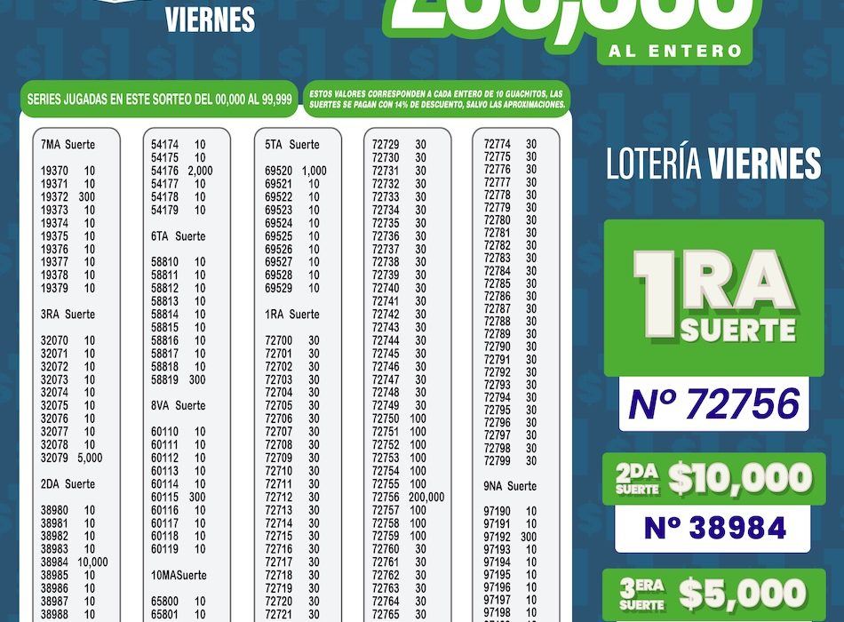Este viernes 14 de noviembre de 2025, a las 20h10, se realizó el Sorteo N.º 7310 de Lotería Nacional, correspondiente a la edición Lotería Viernes, con un premio mayor de $200,000 al entero.