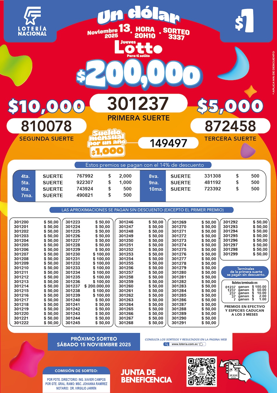 Este jueves 13 de noviembre del 2025, se realizó el sorteo Nº 3337 de Lotto, el juego que por solo un dólar te da la oportunidad de ganar fabulosos premios todas las semanas. El sorteo se llevó a cabo a las 20h10, con total transparencia y bajo la supervisión de la Junta de Beneficencia de Guayaquil.
