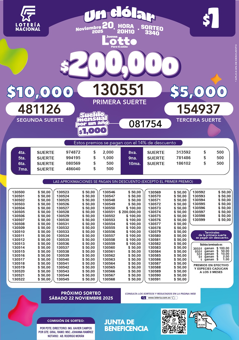 Este jueves 20 de noviembre del 2025, se realizó el sorteo Nº 3340 de Lotto, correspondiente a la edición Lotto Jueves, con un premio mayor de $200,000 al entero. Miles de ecuatorianos participaron con la esperanza de llevarse uno de los premios principales, y aquí te presentamos los resultados oficiales. 🍀✨