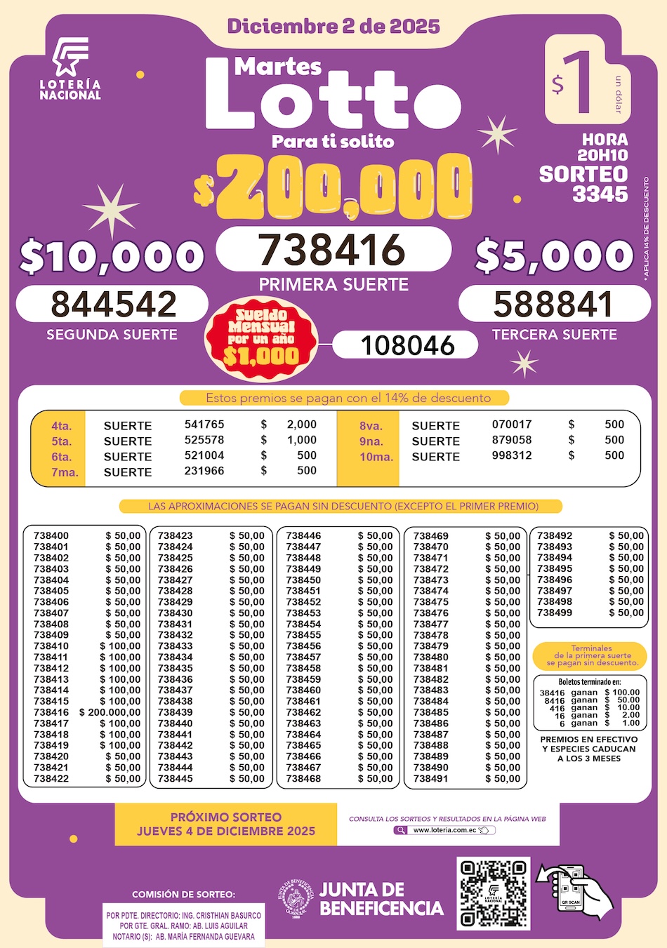 Este martes 02 de diciembre del 2025, a las 20h10, se realizó el Sorteo N.º 3345 de Lotto, el juego de Lotería Nacional que entrega grandes premios cada semana y múltiples oportunidades de ganar.