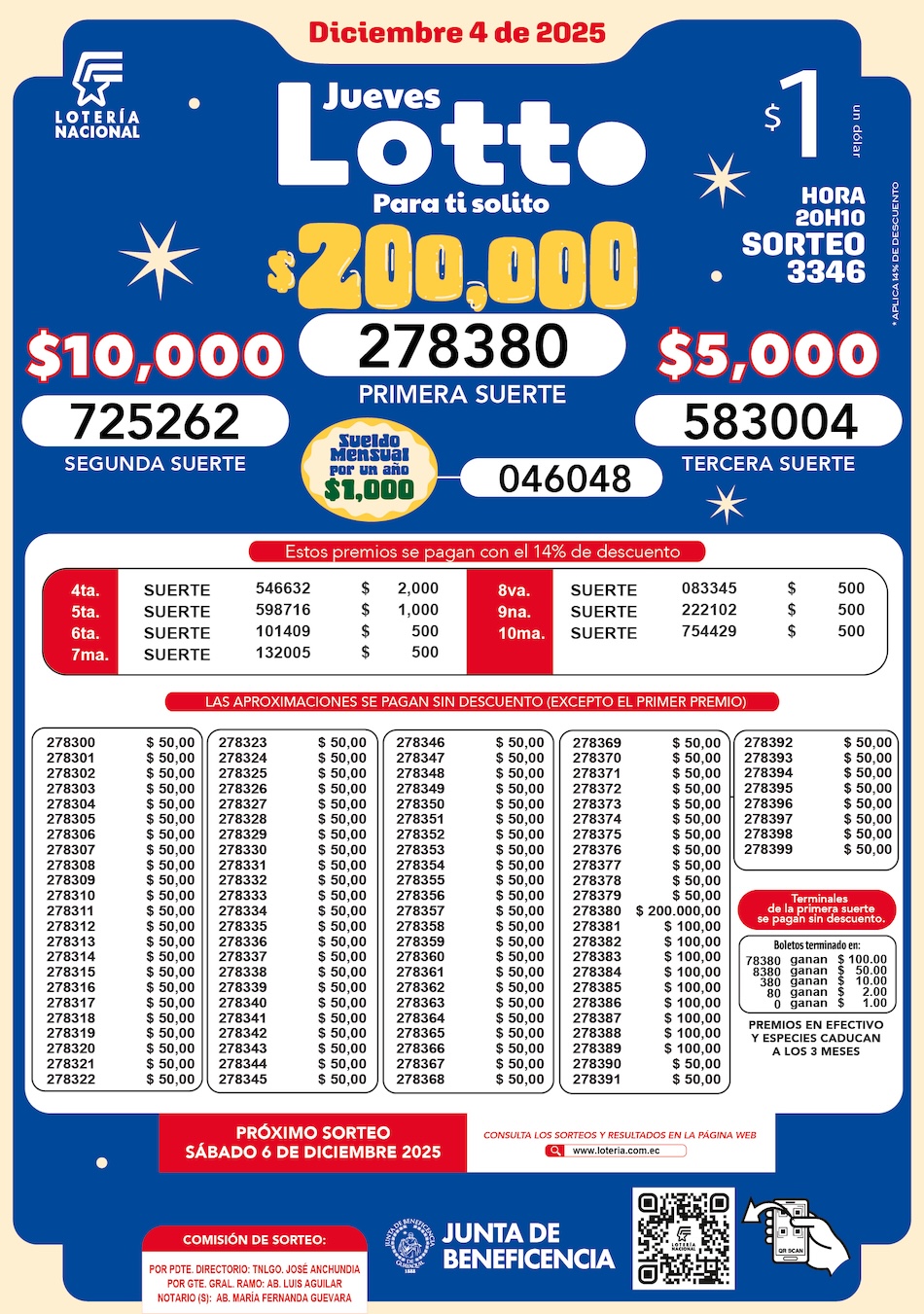 Este jueves 04 de diciembre del 2025, a las 20h10, se realizó el Sorteo N.º 3346 de Lotto, el juego de Lotería Nacional que entrega grandes premios y múltiples oportunidades de ganar en cada edición.