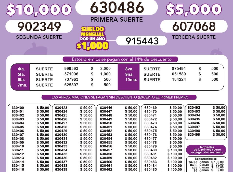 Además, el sorteo contempla cuarta a décima suerte, así como terminaciones y aproximaciones, que se pagan de acuerdo con la normativa vigente de Lotería Nacional.
