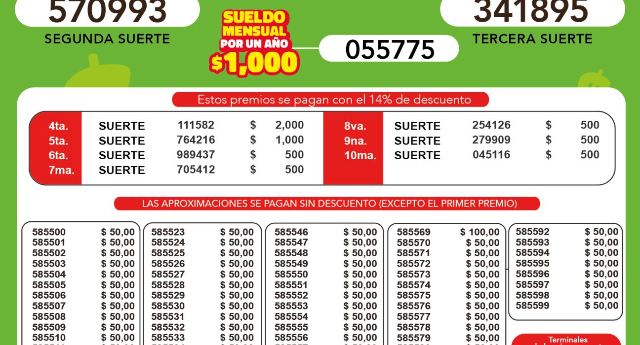 Además, el sorteo contempla cuarta a décima suerte, así como terminaciones y aproximaciones, que se pagan de acuerdo con la normativa vigente de Lotería Nacional.