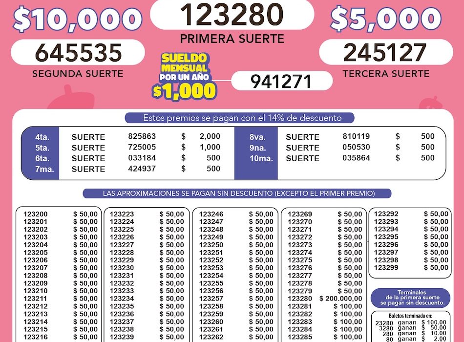 Además, el sorteo contempla cuarta a décima suerte, así como terminaciones y aproximaciones, que se pagan de acuerdo con la normativa vigente de Lotería Nacional.