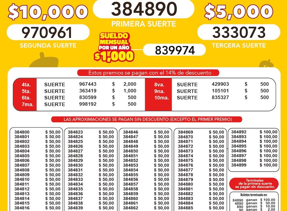 Además, el sorteo contempla cuarta a décima suerte, así como terminaciones y aproximaciones, que se pagan de acuerdo con la normativa vigente de Lotería Nacional.
