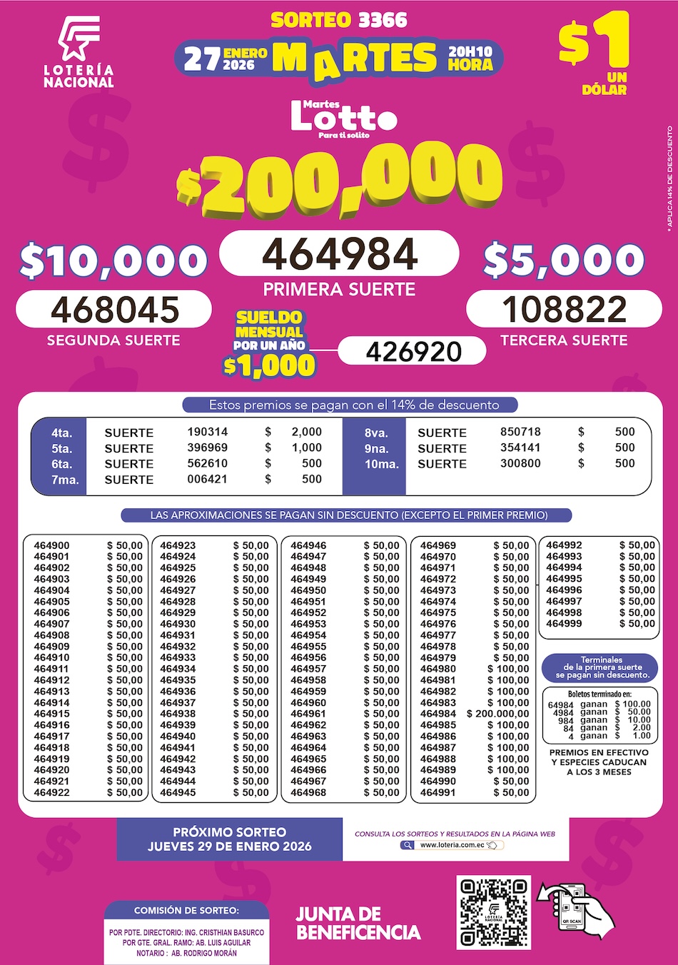 Este martes 27 de enero de 2026, a las 20h10, se realizó el Sorteo N.º 3366 de Lotto, uno de los juegos tradicionales de Lotería Nacional, que volvió a entregar importantes premios en efectivo y un atractivo sueldo mensual.