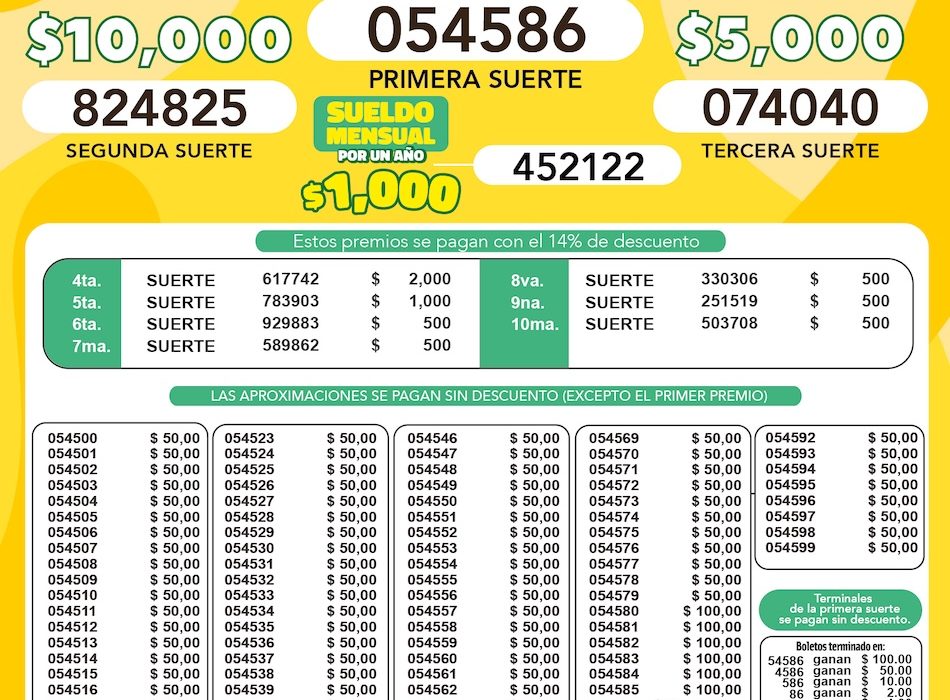 Además, el sorteo contempla cuarta a décima suerte, así como terminaciones y aproximaciones, que se pagan conforme a la normativa vigente.