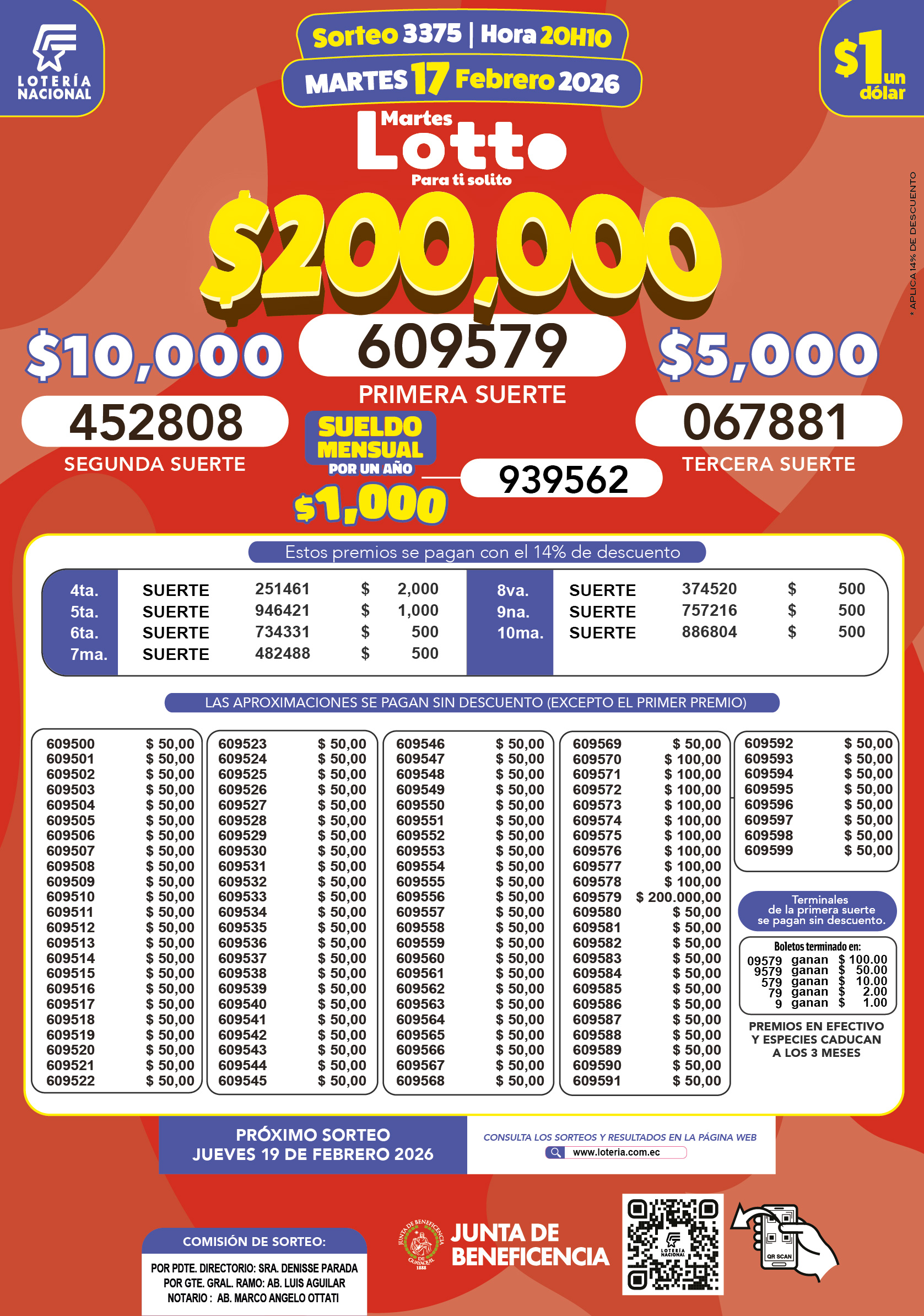 Resultados de Lotto – Sorteo 3375 del martes, 17 de febrero de 2026