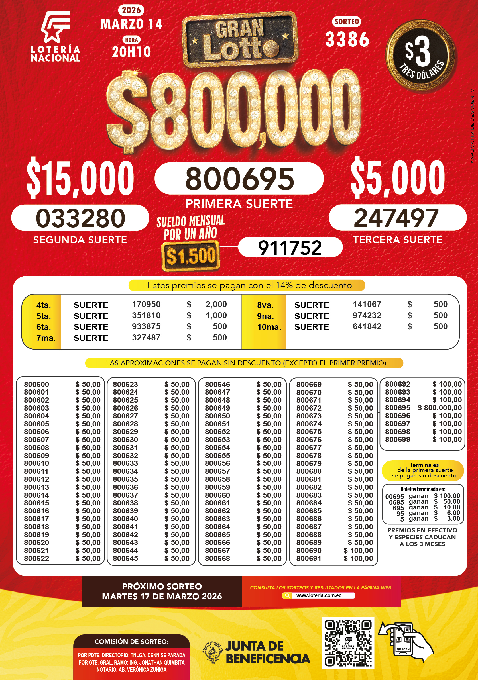 Aquí se encontraran los resultados de Lotto del sorteo 3386 del sábado, 14 de marzo de 2026