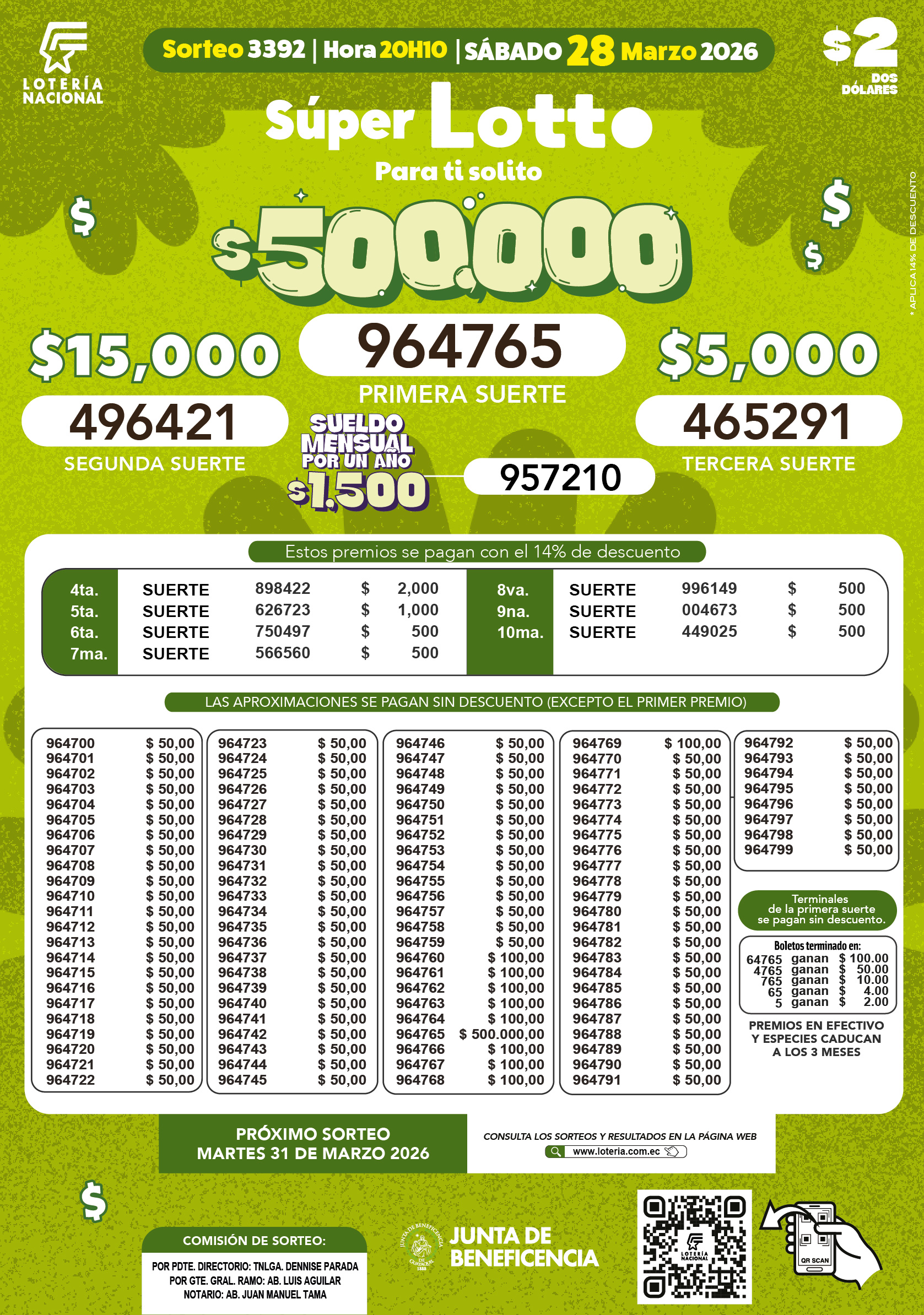 Aquí se encontraran los resultados de Lotto del sorteo 3392 del sábado, 28 de marzo de 2026