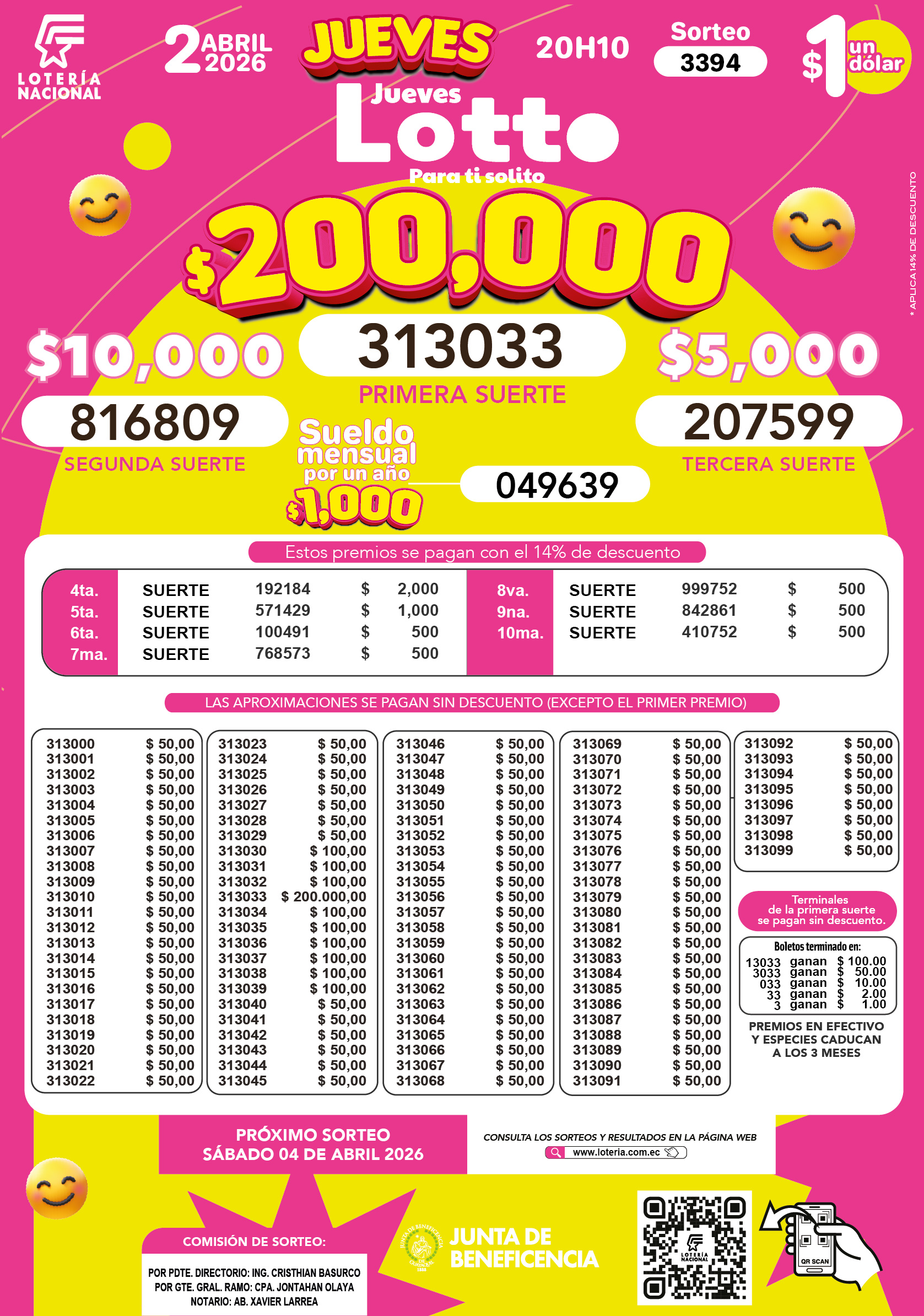 juegos de azar EcuadorJunta de Beneficencia de GuayaquilLotería Nacional EcuadorLottolotto ecuadorlotto juevesnúmeros ganadores Lottopremios lottoresultados LottoSorteos febrero 2026sueldo mensual lotto