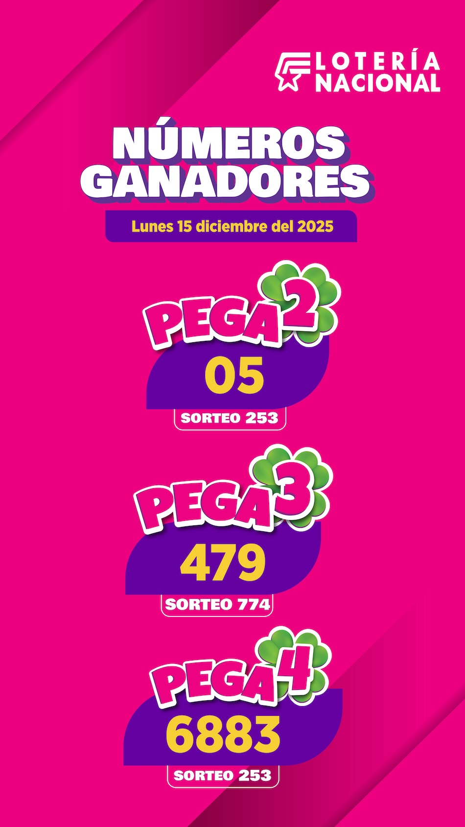 Este lunes 15 de diciembre del 2025, se realizaron los sorteos oficiales de Pega 2, Pega 3 y Pega 4, los juegos diarios de Lotería Nacional que entregan premios inmediatos y múltiples oportunidades de ganar todos los días.
