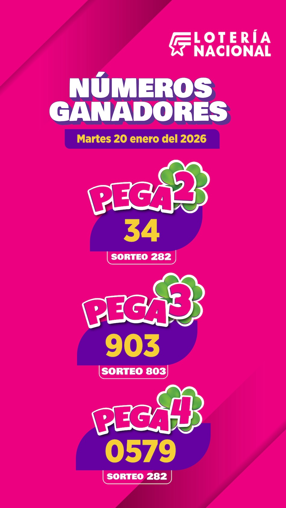 La Lotería Nacional, administrada por la Junta de Beneficencia de Guayaquil, presenta los resultados oficiales de Pega correspondientes al martes 20 de enero del 2026.