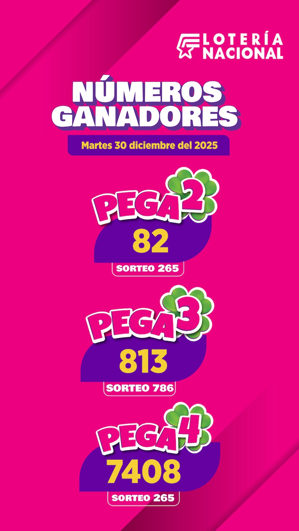 Resultados de Pega – martes 30 de diciembre de 2025