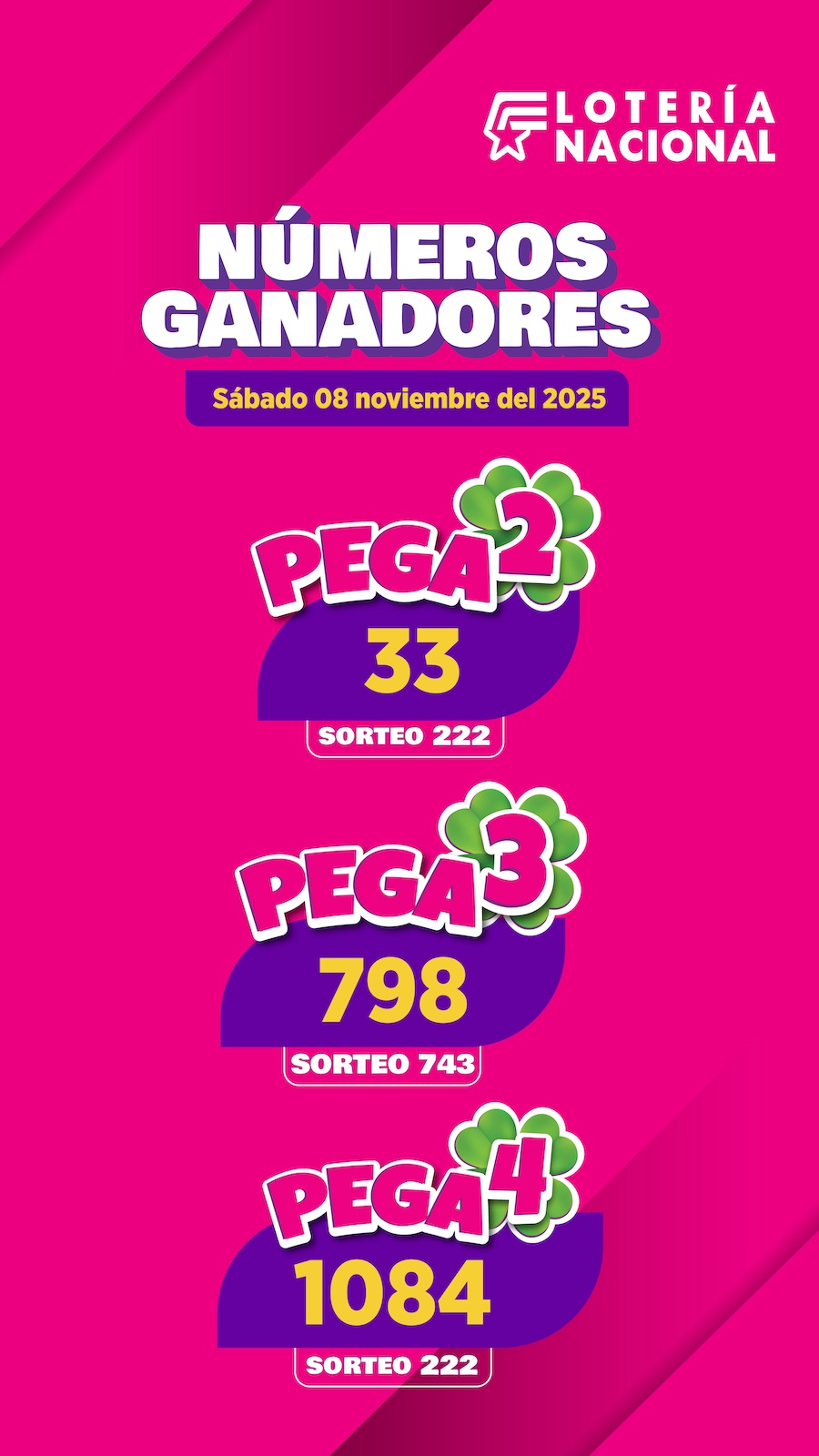 Este sábado 08 de noviembre del 2025 se realizaron los sorteos diarios de Pega 2, Pega 3 y Pega 4, juegos rápidos y muy populares entre nuestros participantes por su facilidad de jugar y múltiples oportunidades de ganar cada día. A continuación, presentamos los números favorecidos del sorteo.