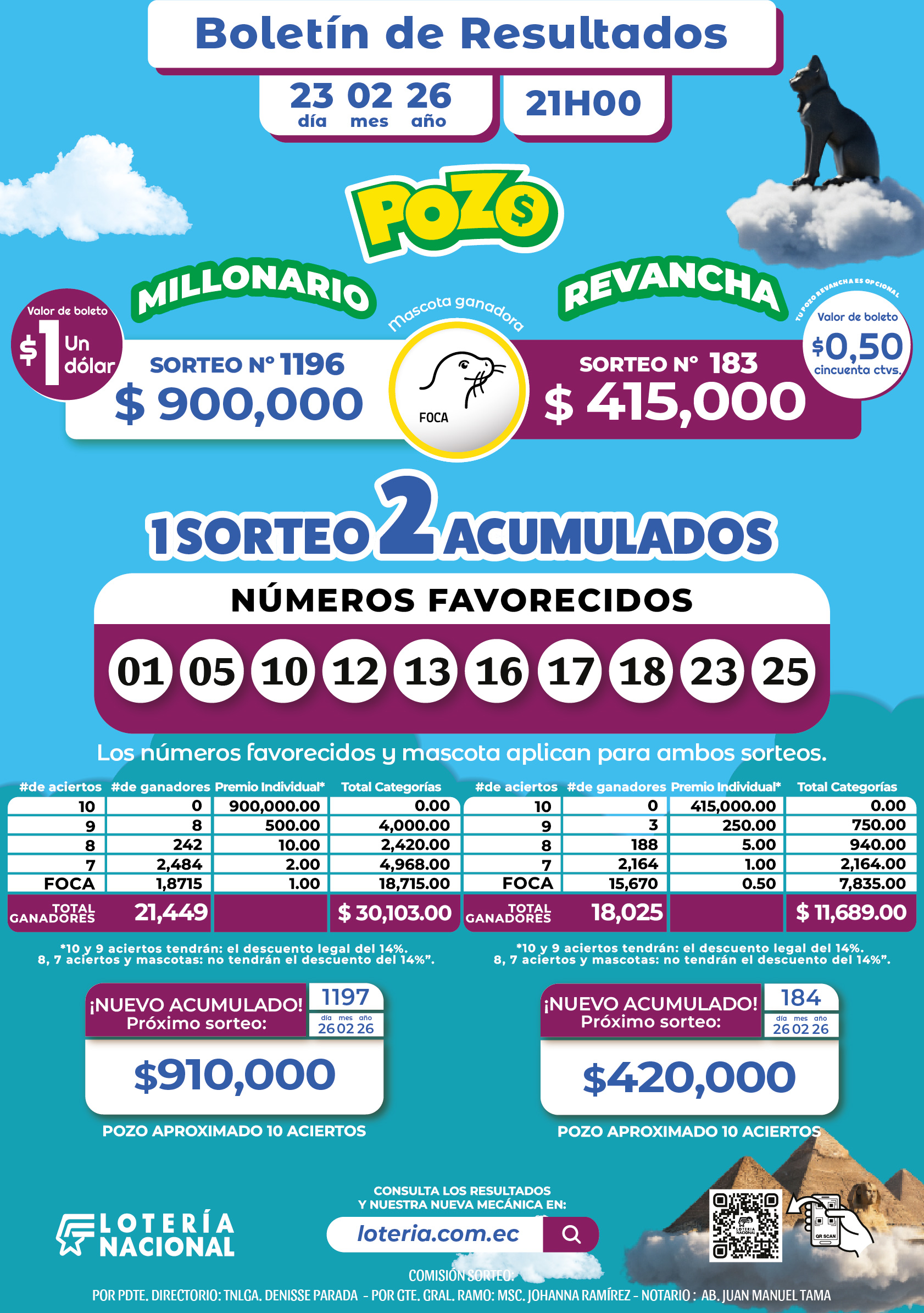 Aquí encontrarás los resultados de Pozo Millonario sorteo 1196 del y Pozo Revancha Sorteo 183 del lunes, 23 de febrero de 2026