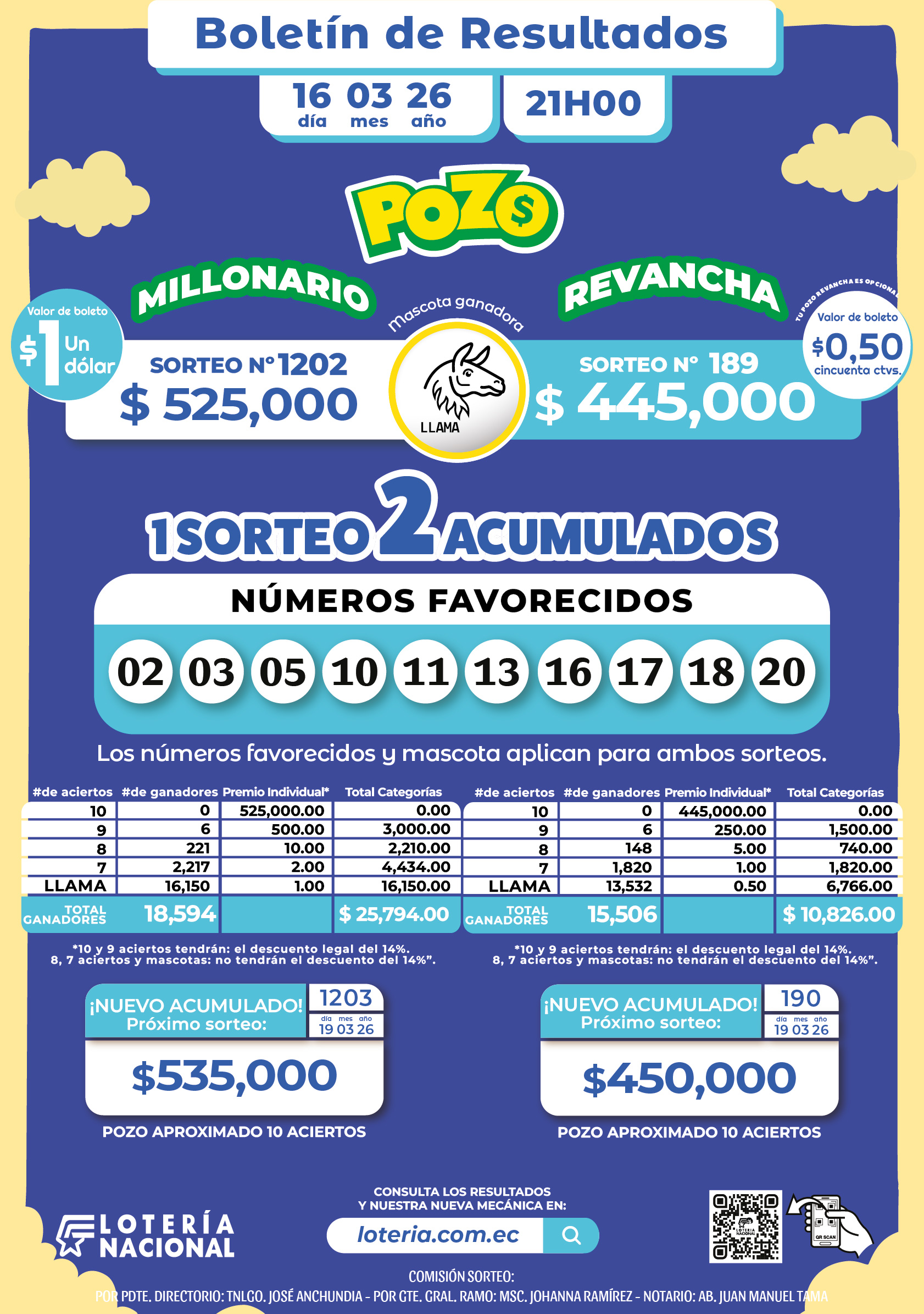 Aquí encontrarás los resultados de Pozo Millonario sorteo 1202 del y Pozo Revancha Sorteo 189 del lunes, 16 de marzo de 2026