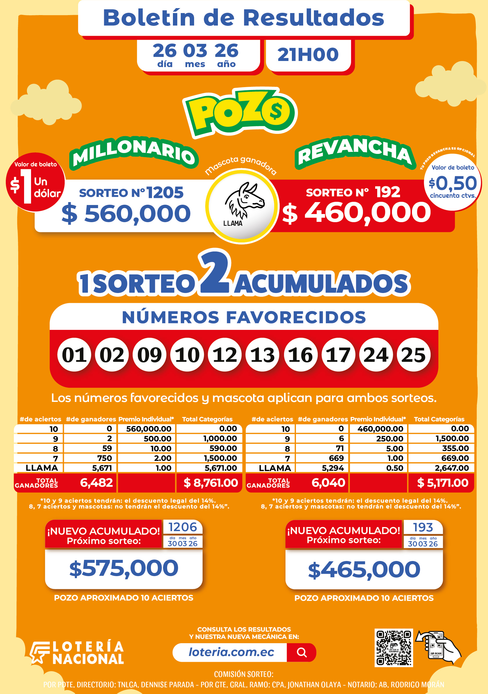 Aquí encontrarás los resultados de Pozo Millonario sorteo 1205 del y Pozo Revancha Sorteo 192 del jueves, 26 de marzo de 2026