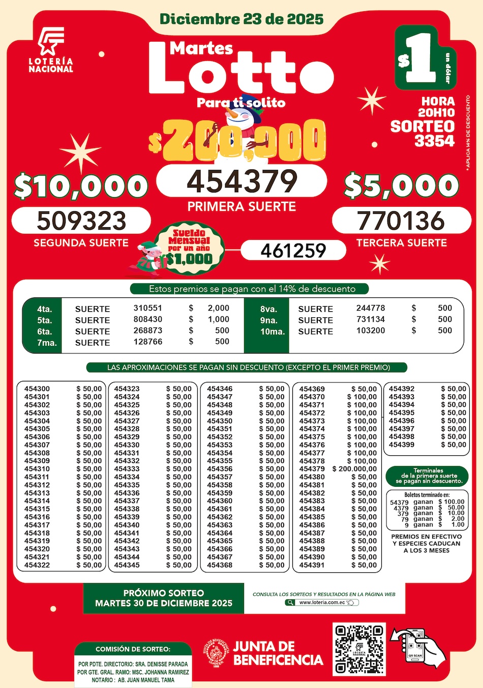 Este martes 23 de diciembre de 2025, a las 20h10, se realizó el Sorteo N.º 3354 de Súper Lotto, con un atractivo premio mayor de USD 200.000, correspondiente a la Primera Suerte, consolidando una nueva jornada de premios dentro del portafolio de juegos de Lotería Nacional.