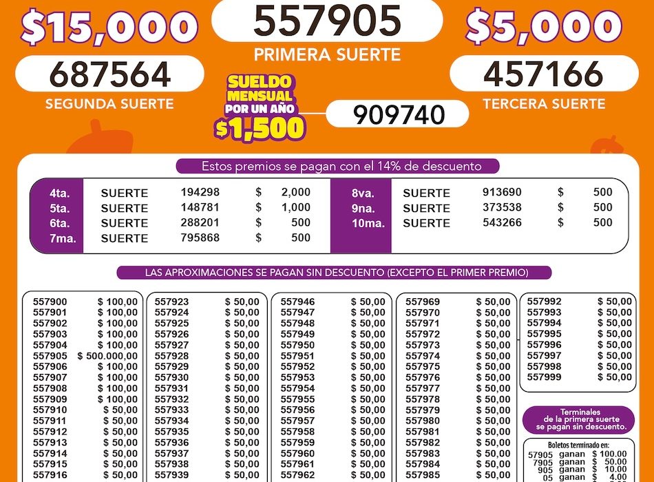 Además, el sorteo contempla cuarta a décima suerte, así como terminaciones y aproximaciones, que se pagan de acuerdo con la normativa vigente de Lotería Nacional.